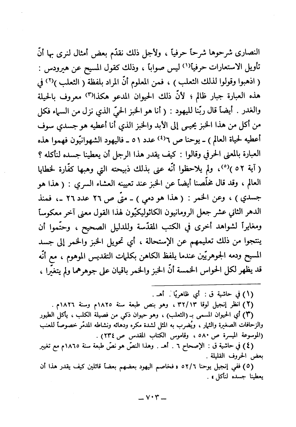 النصارى شرحوها شرحاً حرفياً، ولأجل ذلك نقدم بعض أمثال لنرى بها أن تأويل الاستعارات حرفياً ليس صواباً، وذلك كقول المسيح عن هيرودس اذهبوا وقولوا لذلك الثعلب، فمن المعلوم أن المراد بلفظة الثعلب في هذه العبارة جبار ظالم لأن ذلك الحيوان المدعو هكذا معروف بالحيلة والغدر أيضاً، قال ربنا لليهود: أنا هو الخبز الحي الذي نزل من السماء فكل من أكل من هذا الخبز يحيا إلى الأبد، والخبز الذي أنا أعطيه هو جسدي سوف أعطيه لحياة العالم، يوحنا ص 6 عدد 15، فاليهود الشهوانيون فهموا هذه العبارة بالمعنى الحرفي