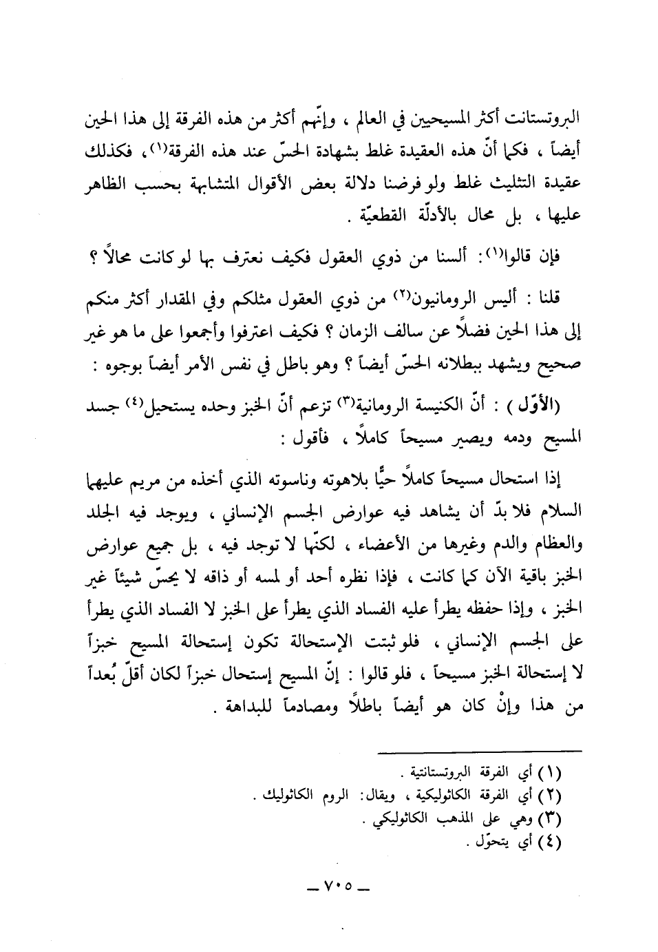 (الأول) أن الكنيسة الرومانية تزعم أن الخبز وحده يستحيل جسد المسيح ودمه ويصير مسيحاً كاملاً، فأقول إذا استحال مسيحاً كاملاً حياً بلاهوته وناسوته الذي أخذه من مريم عليهما السلام، فلا بد أن يشاهد فيه عوارض الجسم الإنساني ويوجد فيه الجلد والعظام والدم وغيرها من الأعضاء لكنها لا توجد فيه بل جميع عوارض الخبز باقية الآن كما كانت فإذا نظره أحد أو لمسه أو ذاقه لا يحس شيئاً غير الخبز، وإذا حفظه يطرأ عليه الفساد الذي يطرأ على الخبز لا الفساد الذي يطرأ على الجسم الإنساني، فلو ثبتت الاستحالة تكون استحالة المسيح خبزاً لا استحالة الخبز مسيحاً، فلو قالوا إن المسيح استحال خبزاً لكان أقل بعداً من هذا، وإن كان هو أيضاً باطلاً ومصادماً للبداهة.