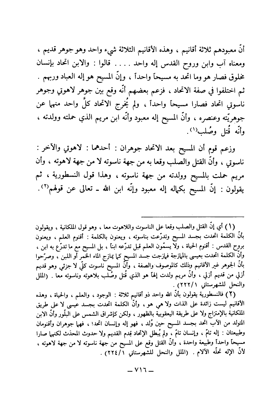 أن معبودهم ثلاثة أقانيم، وهذه الأقانيم الثلاثة هي واحد وهو جوهر قديم ومعناه أب وابن وروح القدس إله واحد" ثم قال "قالوا الابن اتحد بإنسان مخلوق فصار هو وما اتحد به مسيحاً واحداً، وإن المسيح هو إله العباد وربهم، ثم اختلفوا في صفة الاتحاد فزعم بعضهم أنه وقع بين جوهر لاهوتي وجوهر ناسوتي اتحاد، ولم يخرج الاتحاد كل واحد منهما عن جوهريته وعنصره، وإن المسيح إله معبود وإنه ابن مريم الذي حملته وولدته، وإنه قتل وصلب، وزعم قوم أن المسيح بعد الاتحاد جوهران أحدهما لاهوتي والآخر ناسوتي، وأن القتل والصلب وقعا من جهة ناسوته لا من جهة لاهوته، وأن مريم حملت بالمسيح وولدته من جهة ناسوته، وهذا قول النسطورية، ثم يقولون إن المسيح بكماله إله معبود وإنه ابن الله تعالى الله عن قولهم،.