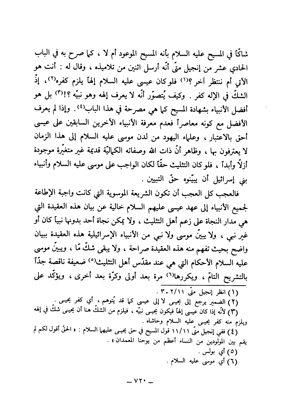 شاكاً في المسيح عليه السلام بأنه المسيح الموعود به أم لا، كما صرح به في الباب الحادي عشر من إنجيل متى أنه أرسل اثنين من تلاميذه وقال له أنت هو الآتي أم ننتظر آخر؟، فلو كان عيسى عليه السلام إلهاً يلزم كفره إذ الشك في الإله كفر، وكيف يتصوّر أنه لا يعرف إلهه وهو نبيه، بل هو أفضل الأنبياء بشهادة المسيح كما هي مصرحة في هذا الباب، وإذا لم يعرف الأفضل مع كونه معاصراً فعدم معرفة الأنبياء الآخرين السابقين على عيسى أحق بالاعتبار، وعلماء اليهود من لدن موسى عليه السلام إلى هذا الزمان لا يعترفون بها، وظاهر أن ذات الله وصفاته الكمالية قديمة غير متغيرة موجودة أزلاً وأبداً، فلو كان التثليث حتماً لكان الواجب على موسى عليه السلام وأنبياء بني إسرائيل أن يبينوه حق التبيين، فالعجب كل العجب أن تكون الشريعة الموسوية التي كانت واجبة الإطاعة لجميع الأنبياء إلى عهد عيسى عليه السلام خالية عن بيان هذه العقيدة التي هي مدار النجاة على زعم أهل التثليث، ولا يمكن نجاة أحد بدونها نبياً كان أو غير نبي، ولا يبين موسى ولا نبي من الأنبياء الإسرائيلية هذه العقيدة ببيان واضح،