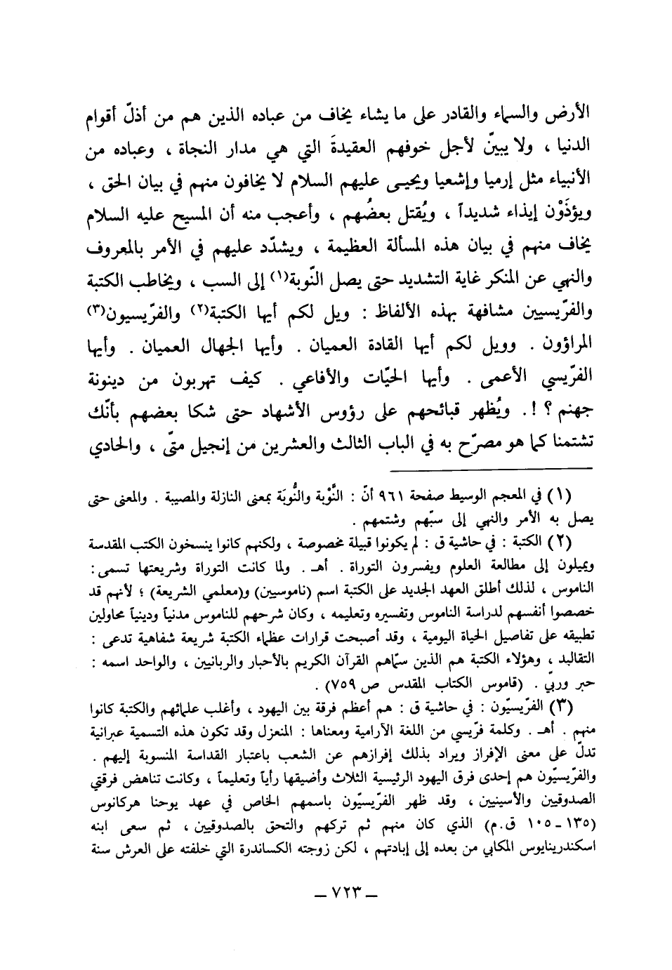 وعباده من الأنبياء مثل أرمياء وأشعياء ويحيى عليهم السلام لا يخافون منهم في بيان الحق ويؤذَوْن إيذاء شديداً ويقتل بعضهم، وأعجب منه أن المسيح عليه السلام يخاف منهم في بيان هذه المسألة العظيمة، ويشدد عليهم في الأمر بالمعروف والنهي عن المنكر غاية التشديد حتى تصل النوبة إلى السب، ويخاطب الكتبة والفريسيين مشافهة بهذه الألفاظ: ويل لكم أيها الكتبة والفريسيون المراءون، وويل لكم أيها القادة العميان وأيها الجهال العميان، وأيها الفريسي الأعمى، وأيها الحيات والأفاعي كيف تهربون من دينونة جهنم، ويظهر قبائحهم على رؤوس الأشهاد، حتى شكا بعضهم بأنك تشتمنا كما هو مصرح به في الباب الثالث والعشرين من إنجيل متّى والحادي