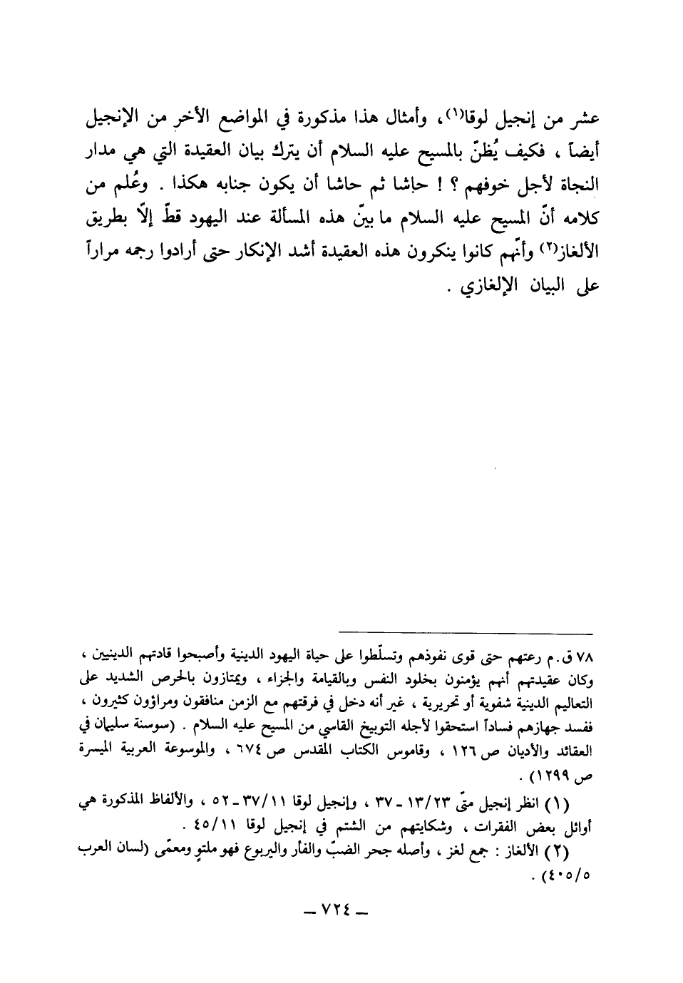 عشر من إنجيل لوقا، وأمثال هذا مذكورة في المواضع الأخر من الإنجيل أيضاً، فكيف يظن بالمسيح عليه السلام أن يترك بيان العقيدة التي هي مدار النجاة لأجل خوفهم؟. حاشا ثم حاشا أن يكون جنابه هكذا، وعلم من كلامه أن المسيح عليه السلام ما بين هذه المسألة عند اليهود قط إلا بطريق الإلغاز وأنهم كانوا ينكرون هذه العقيدة أشد الإنكار حتى أرادوا رجمه مراراً على البيان الإلغازي.