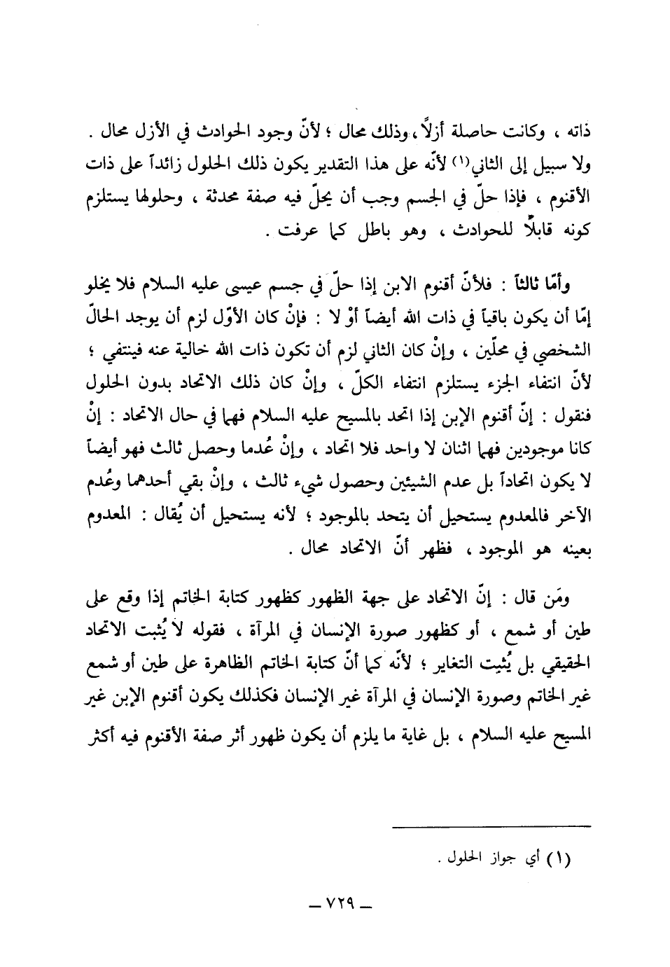 وأما ثالثاً فلأن أقنوم الابن إذا حل في جسم عيسى عليه السلام فلا يخلو إما أن يكون باقياً في ذات الله أيضاً أو لا فإن كان الأول لزم أن يوجد الحال الشخصي في محلين، وإن كان الثاني لزم أن يكون ذات الله خالية عنه فينتفي لأن انتفاء الجزء يستلزم انتفاء الكل، وإن كان ذلك الاتحاد بدون الحلول فنقول إنّ أقنوم الابن إذا اتحد بالمسيح عليه السلام فهما في حال الاتحاد إن كانا موجودين فهما اثنان لا واحد فلا اتحاد، وإن عدما وحصل ثالث فهو أيضاً لا يكون اتحاداً بل عدم الشيئين وحصول شيء ثالث، وإن بقي أحدهما وعدم الآخر فالمعدوم يستحيل أن يتحد بالموجود لأنه يستحيل أن يقال المعدوم بعينه هو الموجود، فظهر أن الاتحاد محال، ومن قال إن الاتحاد على جهة الظهور كظهور كتابة الخاتم إذا وقع على طين أو شمع أو كظهور صورة الإنسان في المرآة فقوله لا يثبت الاتحاد الحقيقي بل يثبت التغاير، لأنه كما أن كتابة الخاتم الظاهرة على طين أو شمع غير الخاتم وصورة الإنسان في المرآة غير الإنسان، فكذلك يكون أقنوم الابن غير المسيح عليه السلام، بل غاية ما يلزم أن يكون ظهور أثر صفة الأقنوم فيه أكثر