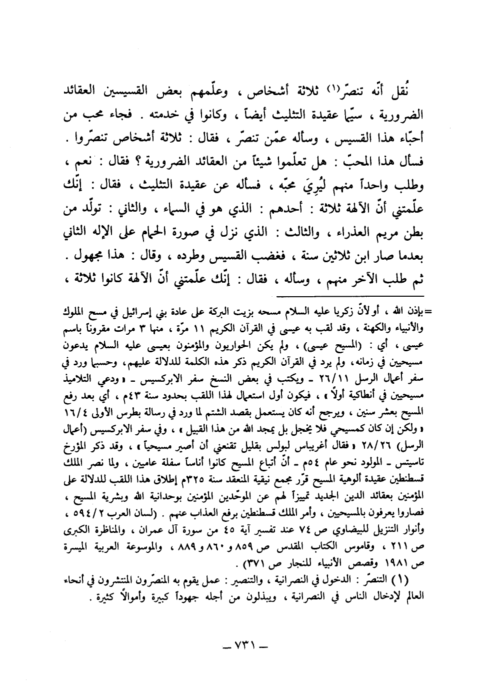 نقل أنه تنصر ثلاثة أشخاص وعلمهم بعض القسيسين العقائد الضرورية سيما عقيدة التثليث أيضاً، وكانوا في خدمته فجاء محب من أحبَّاء هذا القسيس وسأله عمن تنصر؟ فقال: ثلاثة أشخاص تنصروا، فسأل هذا المحب: هل تعلموا شيئاً من العقائد الضرورية، فقال: نعم، وطلب واحداً منهم ليرى محبه فسأله عن عقيدة التثليث، فقال: إنك علمتني أن الآلهة ثلاثة أحدهم الذي هو في السماء والثاني تولد من بطن مريم العذراء والثالث الذي نزل في صورة الحمام على الإله الثاني بعد ما صار ابن ثلاثين سنة، فغضب القسيس وطرده، وقال: هذا مجهول، ثم طلب الآخر منهم وسأله فقال: إنك علمتني أن الآلهة كانوا ثلاثة