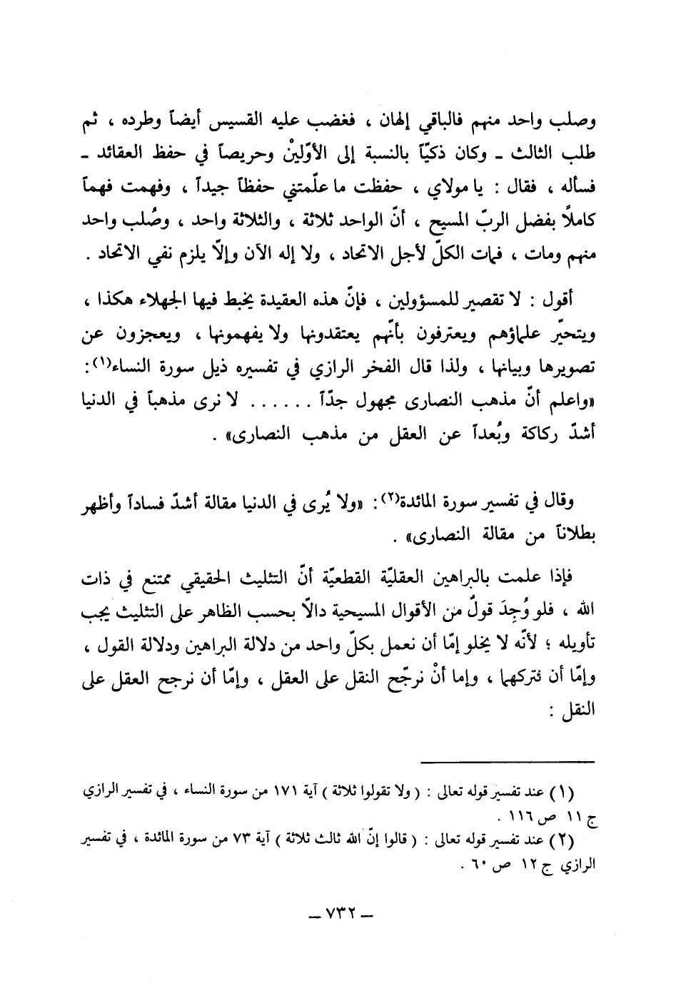 فيها الجهلاء هكذا ويتحير علماؤهم، ويعترفون بأنا نعتقد ولا نفهم، ويعجزون عن تصويرها وبيانها، ولذا قال الفخر الرازي في تفسيره ذيل تفسير سورة النساء: "واعلم أن مذهب النصارى مجهول جداً" ثم قال: "لا نرى مذهباً في الدنيا أشدّ ركاكة وبعداً من العقل من مذهب النصارى" وقال في تفسير سورة المائدة: "ولا نرى في الدنيا مقالة أشد فساداً وأظهر بطلاناً من مقالة النصارى" فإذا علمت بالبراهين العقلية القطعية أن التثليث الحقيقي ممتنع في ذات الله فلو وجد قول من الأقوال المسيحية دالاً بحسب الظاهر على التثليث يجب تأويله، لأنه لا يخلو إما أن نعمل بكل واحد من دلالة البراهين ودلالة القول.