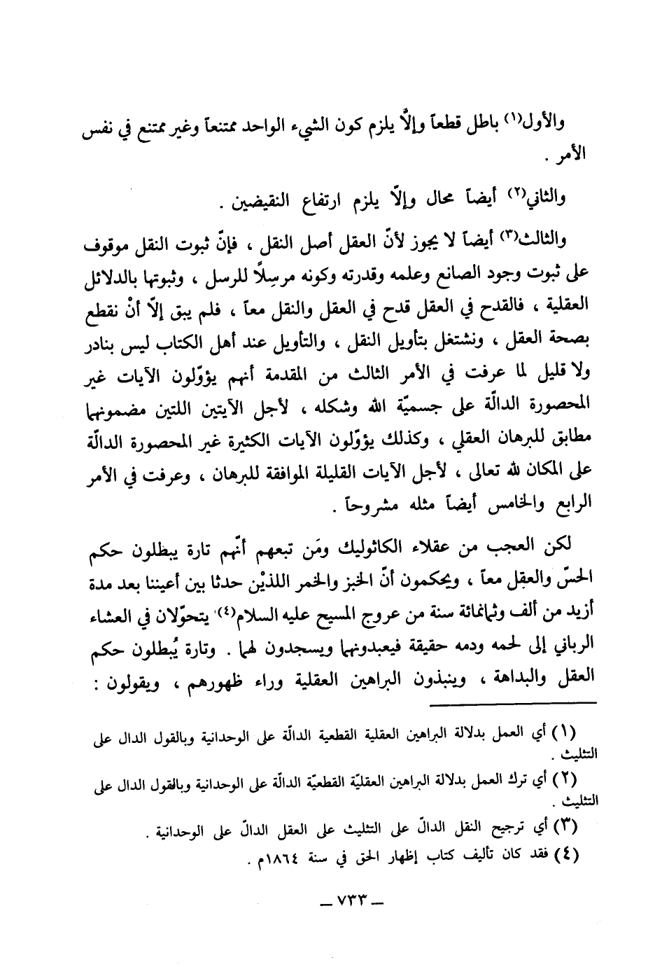 والأول باطل قطعاً ولا يلزم كون الشيء الواحد ممتنعاً وغير ممتنع في نفس الأمر، والثاني أيضاً محال وإلا يلزم ارتفاع النقيضين، والثالث أيضاً لا يجوز لأن العقل أصل النقل فإن ثبوت النقل موقوف على وجود الصانع وعلمه وقدرته وكونه مرسلاً للرسل، وثبوتها بالدلائل العقلية، فالقدح في العقل قدح في العقل والنقل معاً، فلم يبق إلا أن نقطع بصحة العقل ونشتغل بتأويل النقل، والتأويل عند أهل الكتاب ليس بنادر ولا قليل لما عرفت في الأمر الثالث من المقدمة أنهم يؤولون الآيات الغير المحصورة الدالة على جسمية الله وشكله لأجل الآيتين اللتين مضمونهما مطابق للبرهان العقلي، وكذلك يؤولون الآيات الكثيرة الغير المحصورة الدالة على المكان لله تعالى لأجل الآيات القليلة الموافقة للبرهان، وعرفت في الأمر الرابع والخامس أيضاً مثله مشروحاً لكن العجب من عقلاء الكاثلك ومَنْ تبعهم أنهم تارةً يبطلون حكم الحس والعقل معاً، ويحكمون أن الخبز والخمر اللذين حدثا بين أعيننا بعد مدة أزيد من ألف وثمانمائة سنة من عروج المسيح عليه السلام يتحولان في العشاء الرباني إلى لحمه ودمه حقيقة فيعبدونهما ويسجدون لهما، وتارةً يبطلون حكم العقل والبداهة وينبذون البراهين العقلية وراء ظهورهم، ويقولون: