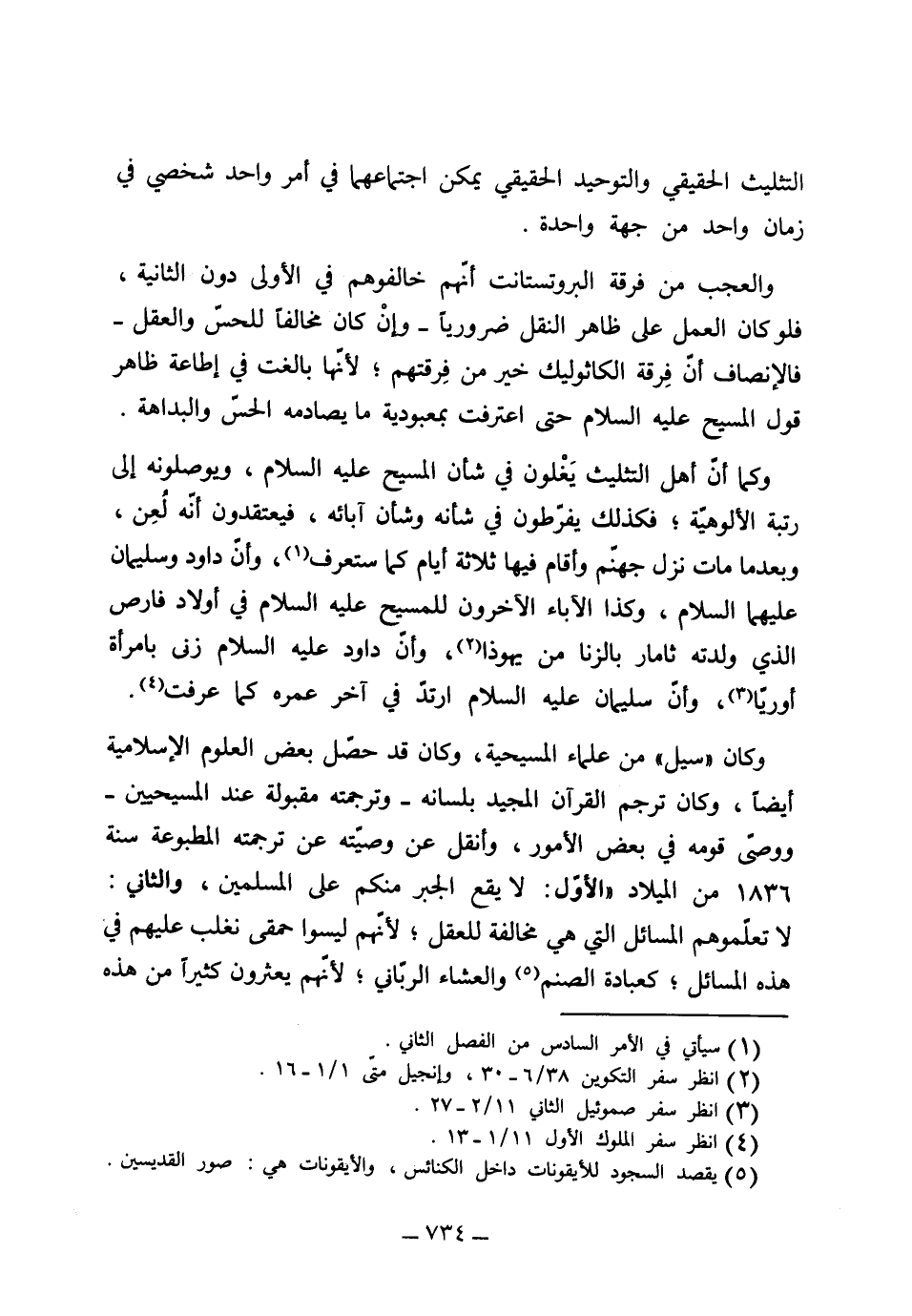 التثليث الحقيقي والتوحيد الحقيقي يمكن اجتماعهما في أمر واحد شخصي في زمان واحد من جهة واحدة، والعجب من فرقة البروتستنت أنهم خالفوهم في الأولى دون الثانية، فلو كان العمل على ظاهر النقل ضرورياً وإن كان مخالفاً للحس والعقل فالإنصاف أن فرقة الكاثلك خير من فرقتهم لأنها بالغت في إطاعة ظاهر قول المسيح عليه السلام حتى اعترفت بمعبودية ما يصادمه الحس والبداهة، وكما أن أهل التثليث