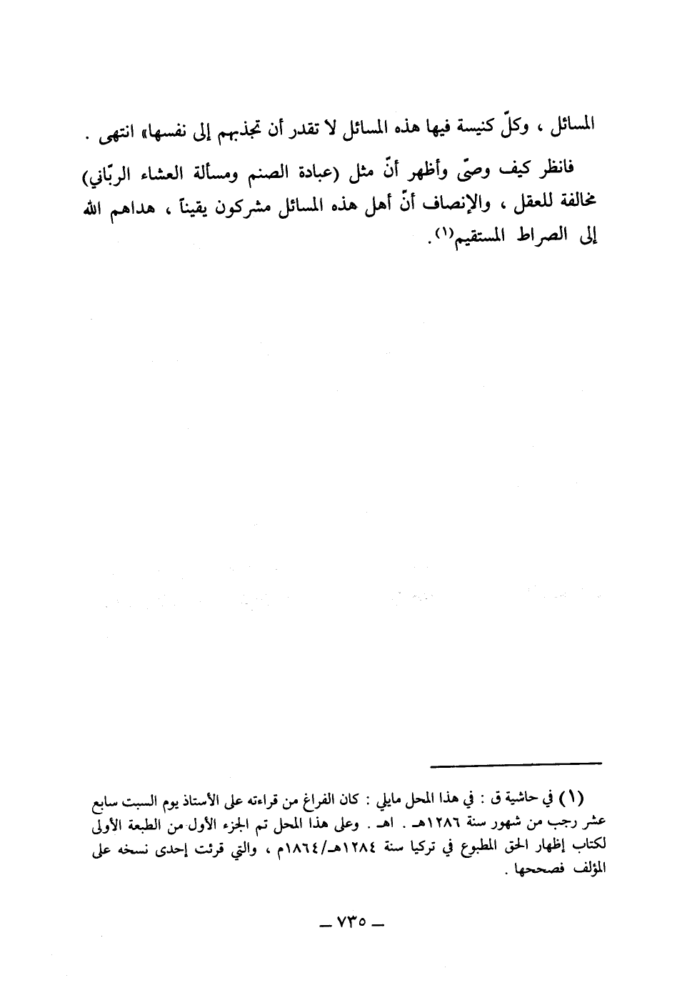 المسائل، وكل كنيسة فيها هذه المسائل لا تقدر أن تجذبهم إلى نفسها" فانظر كيف وصى وأظهر أن مثل عبادة الصنم ومسألة العشاء الرباني مخالفة للعقل الإنصاف، إن أهل هذه المسائل مشركون يقيناً هداهم الله إلى الصراط المستقيم.
