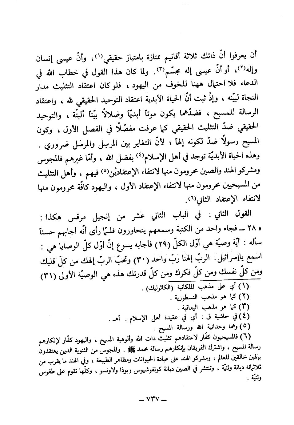 أن يعرفوا أن ذاتك ثلاثة أقانيم ممتازة بامتياز حقيقي وأن عيسى إنسان وإله، أو أن عيسى إله مجسم ولما كان هذا القول في خطاب الله في الدعاء فلا احتمال ههنا للخوف من اليهود فلو كان اعتقاد التثليث مدار النجاة لبينه، وإذ ثبت أن الحياة الأبدية اعتقاد التوحيد الحقيقي لله واعتقاد الرسالة للمسيح فضدهما يكون موتاً أبدياً وضلالاً بيناً ألبتة، والتوحيد الحقيقي ضد للتثليث الحقيقي كما عرفت مفصلاً في الفصل الأول، وكون المسيح رسولاً ضد لكونه إلهاً، لأن التغاير بين المرسِل والمرسَل ضروري، وهذه الحياة الأبدية توجد في أهل الإسلام بفضل الله. وأما غيرهم فالمجوس ومشركو الهند والصين محرومون منها لانتفاء الاعتقادين فيهم، وأهل التثليث من المسيحيين محرومون منها لانتفاء الاعتقاد الأول، واليهود كافة محرومون منها لانتفاء الاعتقاد الثاني.