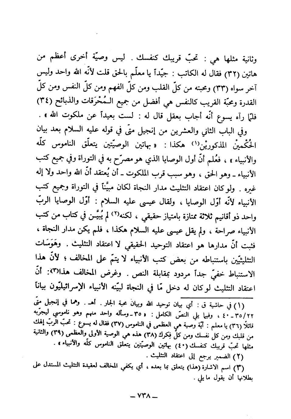 وثانية مثلها هي أن تحب قريبك كنفسك ليس وصية أخرى أعظم من هاتين [32] فقال له الكاتب جيداً يا معلم بالحق قلت لأنه) أي الله (واحد وليس آخر سواه) 33 (ومحبته من كل القلب ومن كل الفهم ومن كل النفس ومن كل القدرة ومحبة القريب كالنفس هي أفضل من جميع المحرقات والذبائح) 34 (فلما رآه يسوع أنه أجاب بعقل قال له لست بعيداً عن ملكوت الله) . وفي الباب الثاني والعشرين من إنجيل متى في قوله عليه السلام بعد بيان الحكمين المذكورين هكذا: (بهاتين الوصيتين يتعلق الناموس والأنبياء) . فعلم أن أول الوصايا الذي هو مصرح به في التوراة وفي جميع كتب الأنبياء وهو الحق وهو سبب قرب الملكوت، أن يعتقد أن الله واحد ولا إله غيره ولو كان اعتقاد التثليث مدار النجاة لكان مبيناً في التوراة وجميع كتب الأنبياء لأنه أول الوصايا، ولقال عيسى عليه السلام: أول الوصايا الرب واحد ذو أقانيم ثلاثة ممتازة بامتياز حقيقي، لكنه لم يبين في كتاب من كتب الأنبياء صراحة ولم يقل عيسى عليه السلام هكذا فلم يكن مدار النجاة.