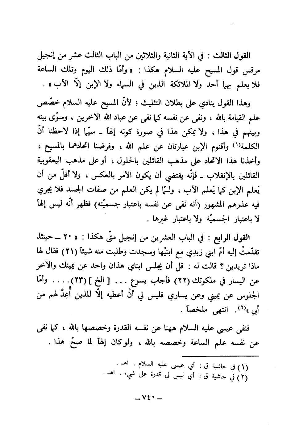 (القول الثالث) في الآية الثانية والثلاثين من الباب الثالث عشر من إنجيل مرقس قول المسيح عليه السلام هكذا: (وأما ذلك اليوم وتلك الساعة فلا يعلم بهما أحد ولا الملائكة الذين في السماء ولا الابن إلا الأب) وهذا القول ينادي على بطلان التثليث لأن المسيح عليه السلام خصص علم القيامة بالله ونفى عن نفسه كما نفى عن عباد الله الآخرين وسوى بينه وبينهم في هذا، ولا يمكن هذا في صورة كونه إلهاً سيما إذا لاحظنا أن الكلمة وأقنوم الابن عبارتان عن علم الله وفرضنا اتحادهما بالمسيح وأخذنا هذا الاتحاد على مذهب القائلين بالحلول أو على مذهب اليعقوبية القائلين بالانقلاب فإنه يقتضي أن يكون الأمر بالعكس ولا أقل من أن يعلم الابن كما يعلم الأب، ولما لم يكن العلم من صفات الجسد فلا يجري فيه عذرهم المشهور أنه نفى عن نفسه باعتبار جسميته فظهر أنه ليس إلهاً لا باعتبار الجسمية ولا باعتبار غيرها.