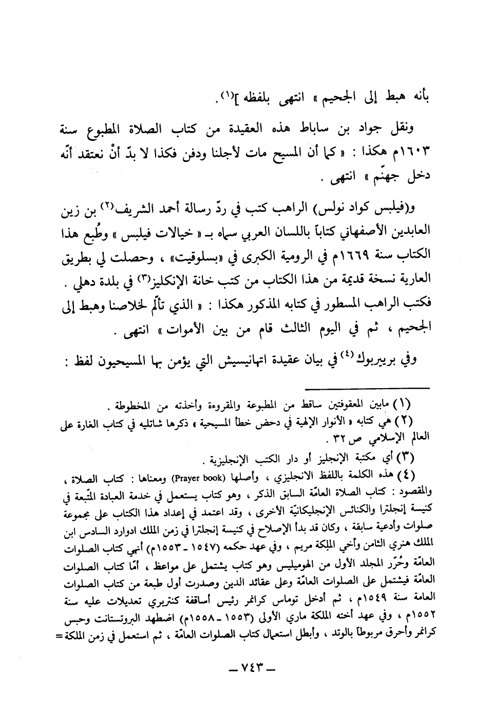 (وفيلبس كوادنولس) الراهب كتب في رد رسالة أحمد الشريف ابن زين العابدين الأصفهاني كتاباً بلسان العرب سماه بخيالات فيلبس وطبع هذا الكتاب سنة 1669 في الرومية الكبرى في بسلوقيت وحصلت لي بطريق العارية نسخة قديمة من هذا الكتاب من كتبخانة إنكليز في بلدة دهلي فكتب الراهب المستور في كتابه المذكور هكذا: (الذي تألم لخلاصنا وهبط إلى الجحيم ثم في اليوم الثالث قام من بين الأموات) انتهى. وفي بريئربوك في بيان عقيدة أتهانييش التي تؤمن بها المسيحيون لفظ