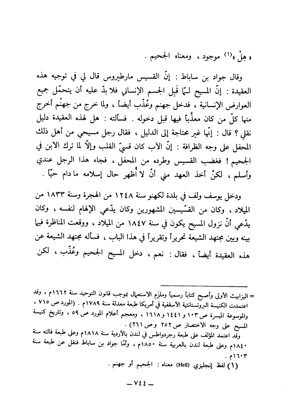 فسألته هل لهذه العقيدة دليل نقلي قال إنها غير محتاجة إلى الدليل، فقال رجل مسيحي من أهل ذلك المحفل على وجه الطرافة إن الأب كان قاسي القلب وإلا لما ترك الابن في الجحيم فغضب القسيس وطرده من المحفل فجاء هذا الرجل عندي وأسلم لكن أخذ العهد مني ألا أظهر حال إسلامه ما دام حياً ودخل يوسف ولف بلدة لكهنو سنة 1248 من الهجرة وسنة 1833 من الميلاد وكان من القسيسين المشهورين وكان يدعي الإلهام لنفسه وكان يدعي أن نزول المسيح يكون في سنة 1847 من الميلاد ووقعت المناظرة فيما بينه وبين مجتهد الشيعة تحريراً وتقريراً في هذا الباب فسأله مجتهد الشيعة عن هذه العقيدة أيضاً فقال نعم دخل المسيح الجحيم وعذب لكن