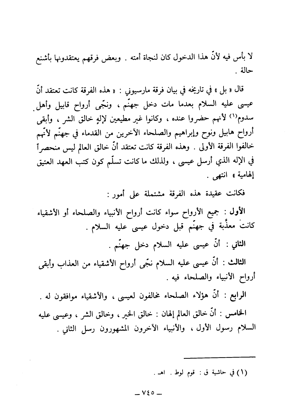 لا بأس فيه لأن هذا الدخول كان لنجاة أمته، وبعض فرقهم يعتقدونها بأشنع حالة، قال بل في تاريخه في بيان فرقة مارسيوني. هذه الفرقة كانت تعتقد أن عيسى عليه السلام بعد ما مات دخل جهنم ونجى أرواح قابيل وأهل سدوم لأنهم حضروا عنده وكانوا غير مطيعين لإله خالق الشر وأبقى أرواح هابيل ونوح وإبراهيم والصلحاء الآخرين من القدماء في جهنم لأنهم خالفوا الفرقة الأولى. (وهذه الفرقة كانت تعتقد أن خالق العالم ليس منحصراً في الإله الذي أرسل عيسى ولذلك ما كانت تسلم كون كتب العهد العتيق إلهامية) انتهى.