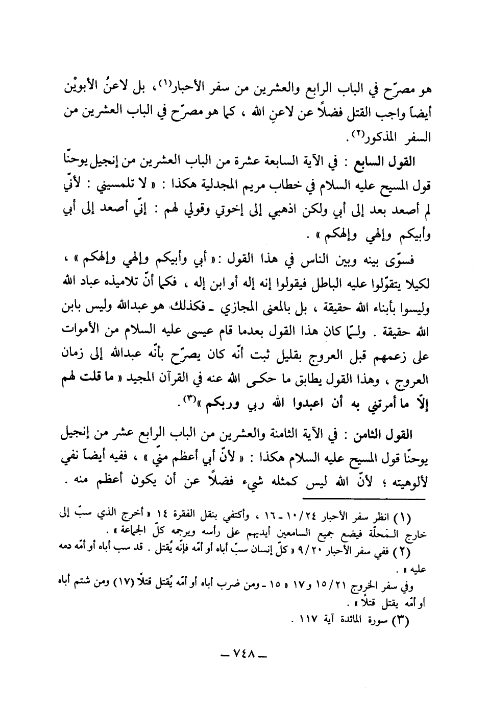 (القول السابع) : في الآية السابعة عشرة من الباب العشرين من إنجيل يوحنا قول المسيح عليه السلام في خطاب مريم المجدلية هكذا: (لا تلمسيني لأني لم أصعد بعد إلى أبي ولكن اذهبي إلى إخوتي وقولي لهم إني أصعد إلى أبي وأبيكم وإلهي وإلهكم) فسوى بينه وبين الناس في هذا القول (أبي وأبيكم وإلهي وإلهكم) لكيلا يتقولوا عليه الباطل فيقولوا إنه إله أو ابن إله فكما أن تلاميذه عباد الله وليسوا بأبناء الله حقيقة بل بالمعنى المجازي فكذلك هو عبد الله وليس بإبن الله حقيقة ولما كان هذا القول بعد ما قام عيسى عليه السلام من الأموات على زعمهم قبل العروج بقليل ثبت أنه كان يصرح بأني عبد الله إلى زمان العروج وهذا القول يطابق ما حكى الله عنه في القرآن المجيد: {ما قلت لهم إلا ما أمرتني به أن اعبدوا الله ربي وربكم} .