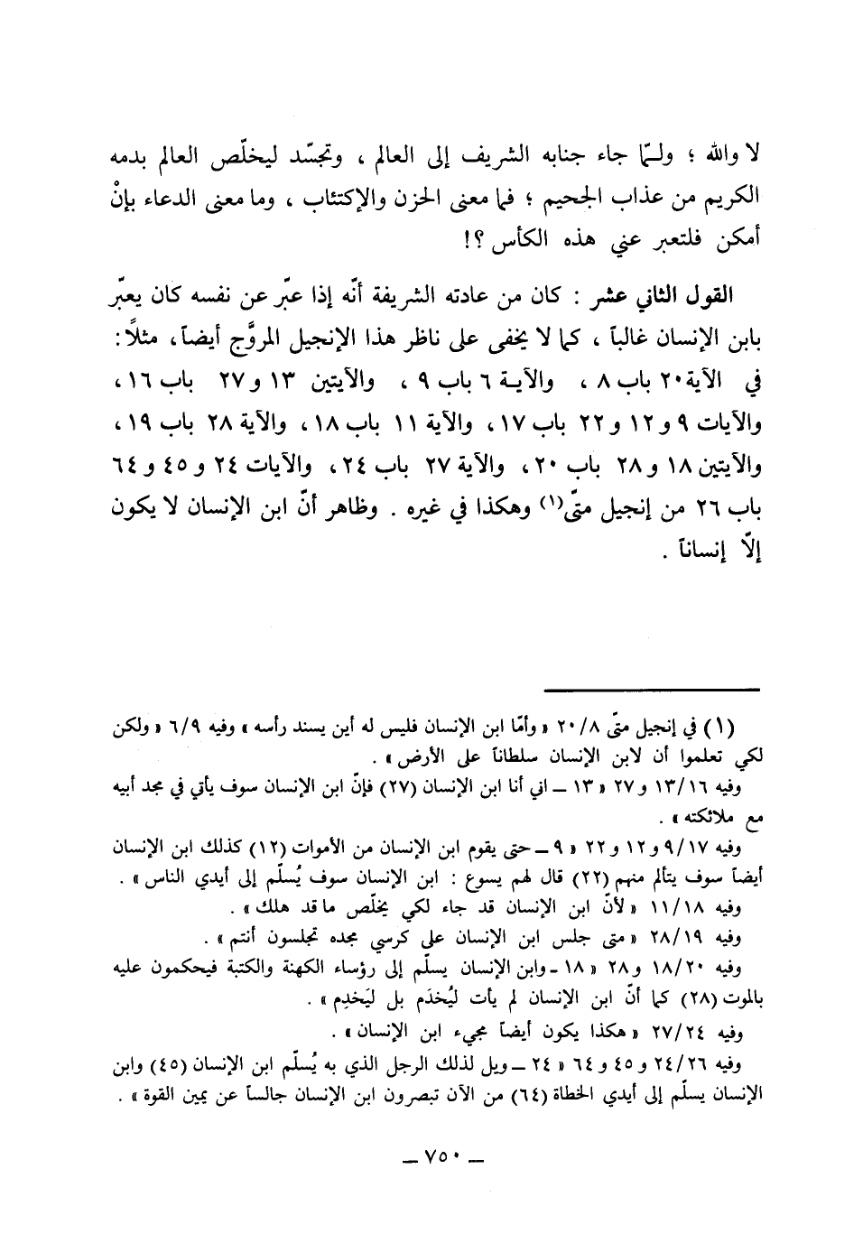 (القول الثاني عشر) : كان من عادته الشريفة أنه إذا عبر عن نفسه كان يعبر بابن الإنسان غالباً كما لا يخفى على ناظر هذا الإنجيل المروج أيضاً: مثلاً في الآية 20 باب 8 و 6 باب 9 و 13 و 27 باب 16 و 9 و 12 و 22 باب 17 و 11 باب 18 و 28 باب 19 و 18 و 28 باب 20 و 27 باب 24 و 24 و 45 و 64 باب 26 من إنجيل متى وهكذا في غيره وظاهر أن ابن الإنسان لا يكون إلا إنساناً.