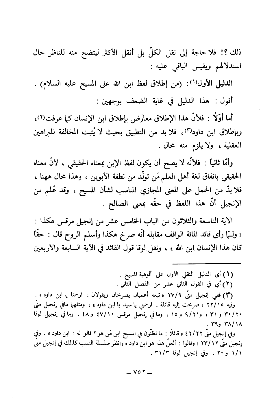 الدليل (الأول) : من إطلاق لفظ ابن الله على المسيح عليه السلام: أقول هذا الدليل في غاية الضعف بوجهين: