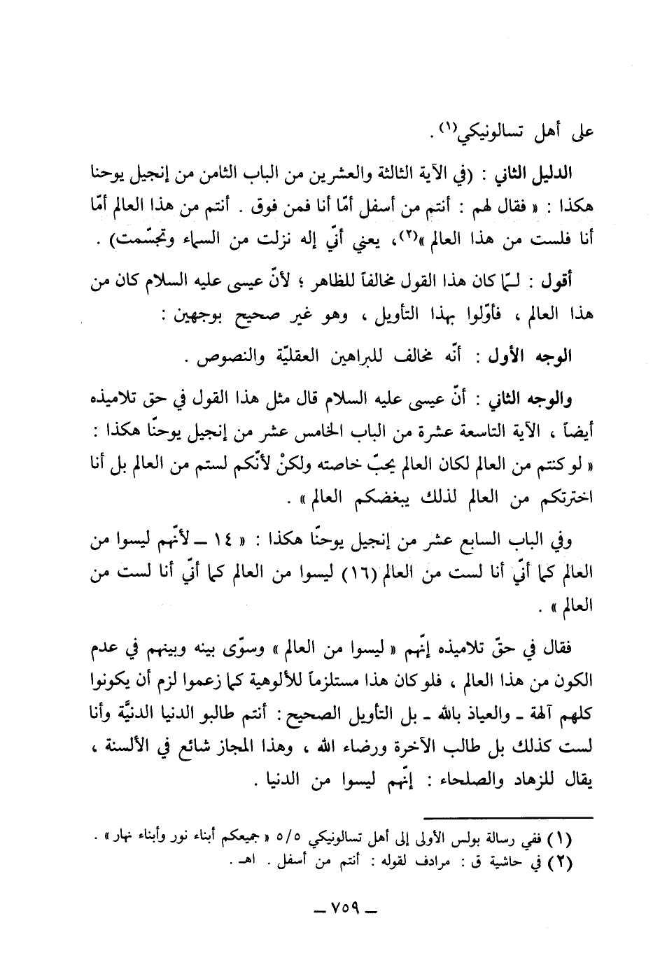 (أقول) : لما كان هذا القول مخالفاً للظاهر لأن عيسى عليه السلام كان من هذا العالم فأولوا بهذا التأويل وهو غير صحيح بوجهين: (الأول) : أنه مخالف للبراهين العقلية والنصوص. (والثاني) : أن عيسى عليه السلام قال مثل هذا القول في حق تلاميذه أيضاً في الآية التاسعة عشرة من الباب الخامس عشر من إنجيل يوحنا هكذا: (لو كنتم من العالم لكان العالم يحب خاصته، ولكن إنكم لستم من العالم بل أنا اخترتكم من العالم لذلك يبغضكم العالم) . وفي الباب السابع من إنجيل يوحنا هكذا 14: (لأنهم ليسوا من العالم كما أني أنا لست من العالم) [16] (ليسوا من العالم كما أني أنا لست من العالم) فقال في حق تلاميذه: إنهم ليسوا من العالم، وسوّى بينه وبينهم في عدم الكون من هذا العالم، فلو كان هذا مستلزماً للألوهية كما زعموا، لزم أن يكونوا كلهم آلهة والعياذ بالله، بل التأويل الصحيح: أنتم طالبو الدنيا الدنية وأنا لست كذلك، بل طالب الآخرة ورضاء الله، وهذا المجاز شائع في الألسنة يقال للزهاد والصلحاء إنهم ليسوا من الدنيا.