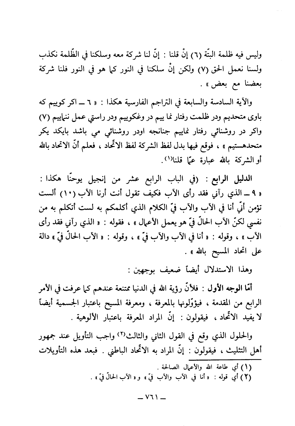 والآية السادسة والسابعة في التراجم الفارسية هكذا: 6 (اكر كونييم كه باوى متحديم ودرظلمت رفتا رنماييم در وغكوييم ودر راستي عمل نتماييم) . 7 وأكردر رو شنائى رفتا رنماييم جنا نجه أودر روشنائي مى باشد بايكد يكر متحد هستيم) فوقع فيها بدل لفظ الشركة لفظ الاتحاد فعلم أن الاتحاد بالله أو الشركة بالله عبارة عما قلنا.