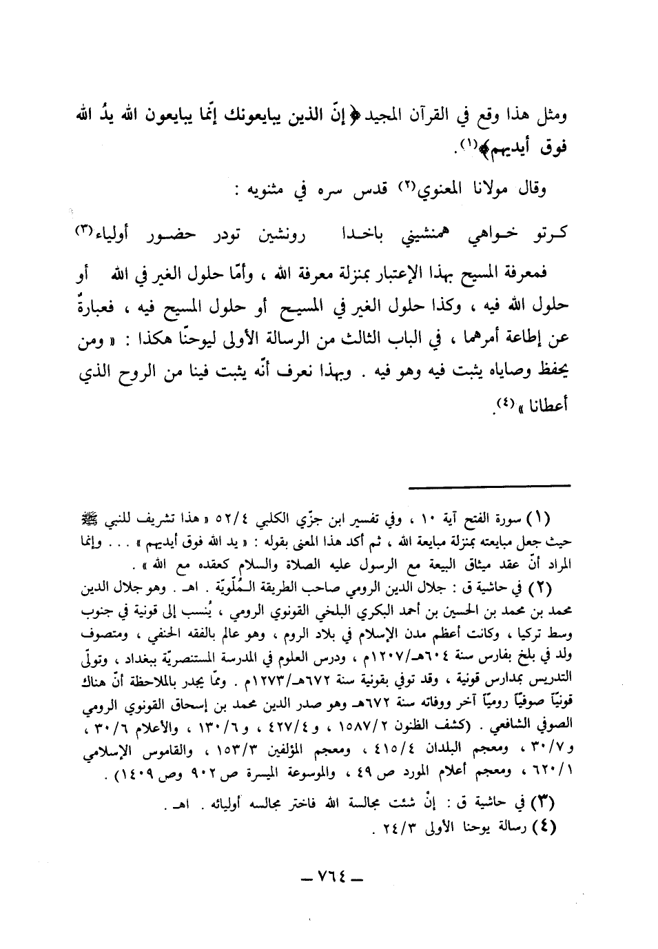 ومثل هذا وقع في القرآن المجيد أيضاً: {إن الذين يبايعونك إنما يبايعون الله يد الله فوق أيديهم} . وقال مولانا المعنوي قدس سره في مثنويه: