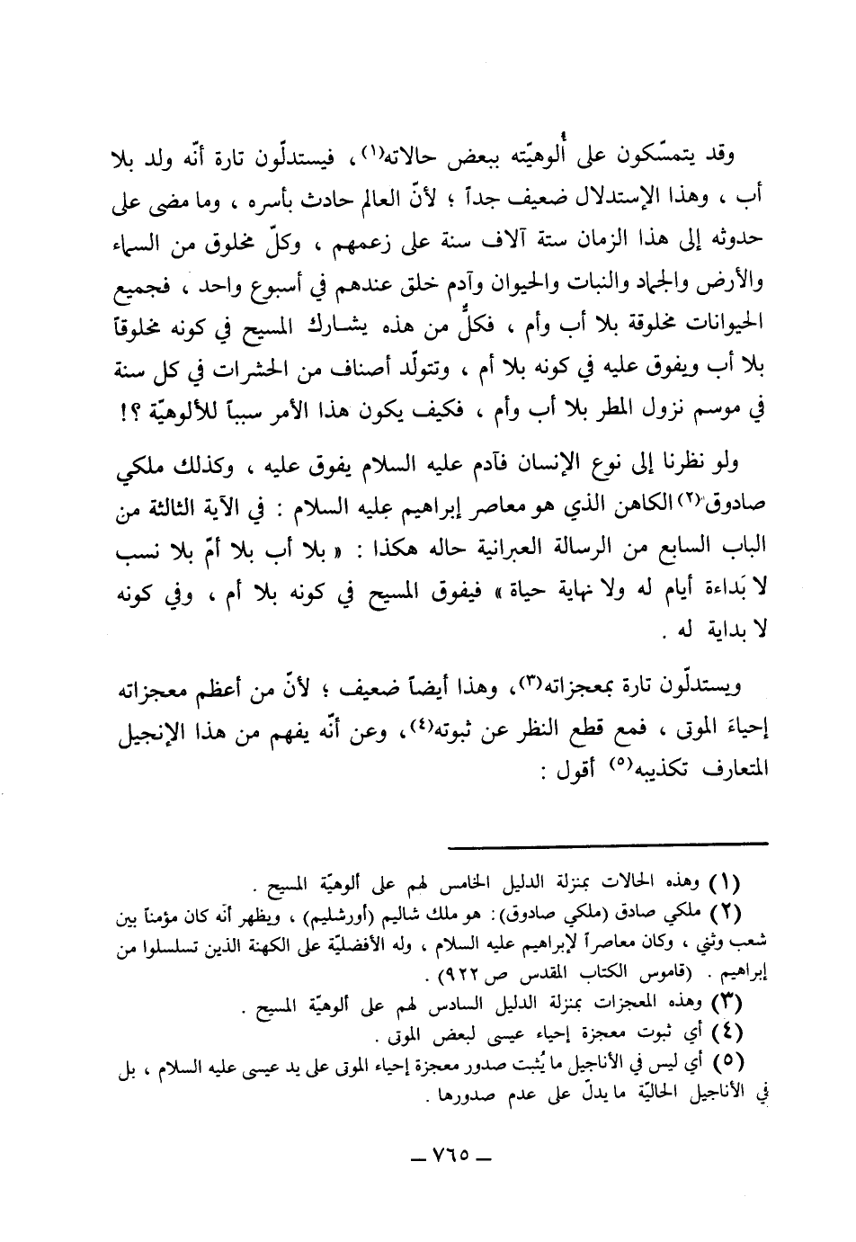 وقد يتمسكون على ألوهيته ببعض حالاته فيستدلون تارة أنه ولد بلا أب وهذا الاستدلال ضعيف جداً، لأن العالم حادث بأسره وما مضى على حدوثه إلى هذا الزمان ستة آلاف سنة على زعمهم. وكل مخلوق من السماء والأرض والجماد والنبات والحيوان وآدم، خلق عندهم في أسبوع واحد فجميع الحيوانات مخلوقة بلا أب وأم فكل من هذه يشارك المسيح في كونه مخلوقاً بلا أب، ويفوق عليه في كونه بلا أم، وتتولد أصناف من الحشرات في كل سنة في موسم نزول المطر بلا أب وأم فكيف يكون هذا الأمر سبباً للألوهية. (ولو نظرنا إلى نوع الإنسان فآدم عليه السلام يفوق عليه، وكذلك ملكي صادوق الكاهن الذي هو معاصر إبراهيم عليه السلام) . في الآية الثالثة من الباب السابع من الرسالة العبرانية حاله هكذا: (بلا أب بلا أم بلا نسب لا بداية أيام له ولا نهاية حياة) فيفوق المسيح في كونه بلا أم وفي كونه لا بداية له ويستدلون تارة بمعجزاته، وهذا أيضاً ضعيف لأن من أعظم معجزاته إحياء الموتى مع قطع النظر عن ثبوته، وعن أنه يفهم من هذا الإنجيل المتعارف تكذيبه.