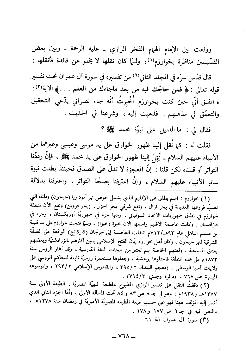 ووقعت بين الإمام الهمام الفخر الرازي عليه الرحمة وبين بعض القسيسين مناظرة بخوارزم ولما كان نقلها لا يخلو عن فائدة فأنقلها: قال قدس سره في المجلد الثاني من تفسيره في سورة آل عمران تحت تفسير قوله تعالى: {فمن حاجك فيه من بعد ما جاءك من العلم} الآية. اتفق أني حين كنت بخوارزم أخبرت أنه جاء نصراني يدعي التحقيق والتعمق في مذهبهم فذهبت إليه وشرعنا في الحديث، فقال لي ما الدليل على نبوة محمد صلى الله عليه وسلم. فقلت له: كما نقل إلينا ظهور الخوارق على يد موسى وعيسى وغيرهما من الأنبياء عليهم السلام، نقل إلينا ظهور الخوارق على يد محمد صلى الله عليه وسلم فإن رددنا التواتر أو قبلناه لكن قلنا إن المعجزة لا تدل على الصدق فحينئذ بطلت نبوة سائر الأنبياء عليهم السلام، وإن اعترفنا بصحة التواتر واعترفنا بدلالة
