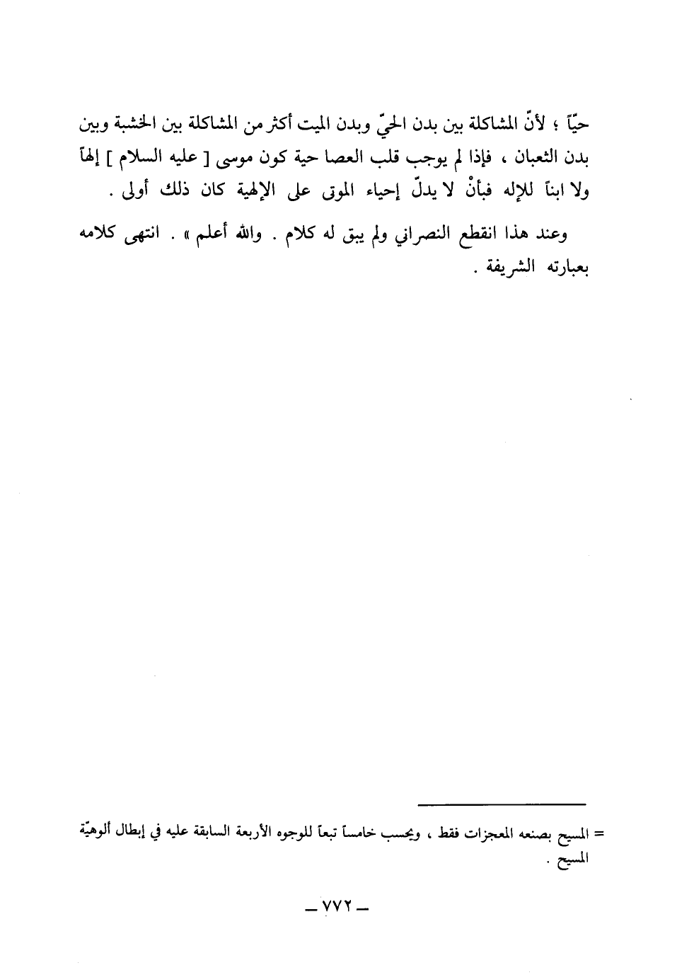 حياً، لأن المشاكلة بين بدن الحي وبدن الميت أكثر من المشاكلة بين الخشبة وبين بدن الثعبان، فإذا لم يوجب قلب العصا حية كون موسى عليه السلام إلهاً وابناً للإله فبأن لا يدل إحياء الموتى على الإلهية كان ذلك أولى وعند هذا انقطع النصراني ولم يبق له كلام والله أعلم. انتهى كلامه بعبارته الشريفة.