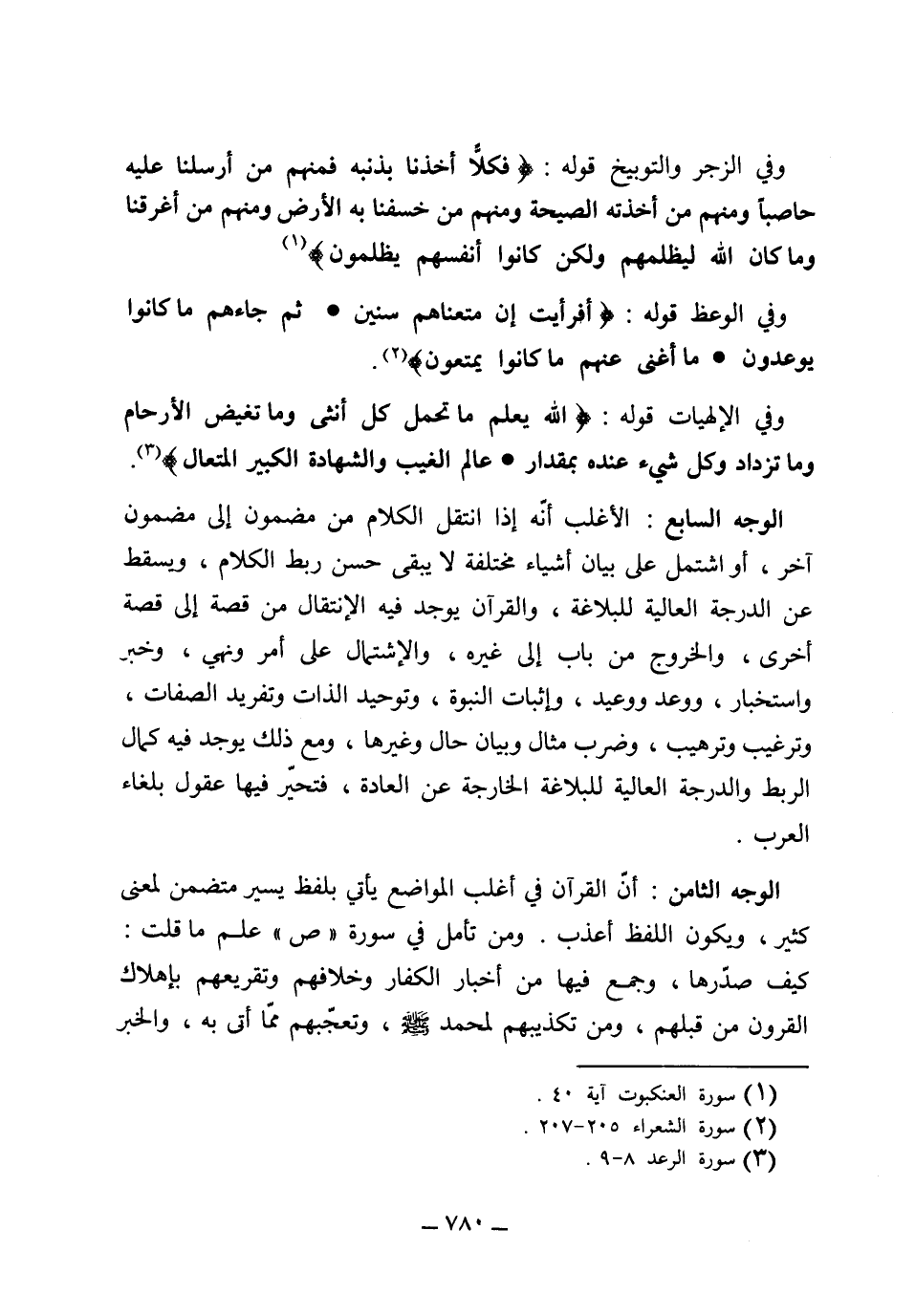 (ثامنها) أن القرآن في أغلب المواضع يأتي بلفظ يسير متضمن لمعنى كثير ويكون اللفظ أعذب، ومن تأمل في سورة (ص) علم ما قلت كيف صدرها وجمع فيها من أخبار الكفار وخلافهم وتقريعهم بإهلاك القرون من قبلهم ومن تكذيبهم لمحمد صلى الله عليه وسلم، وتعجبهم مما أتى به، والخبر