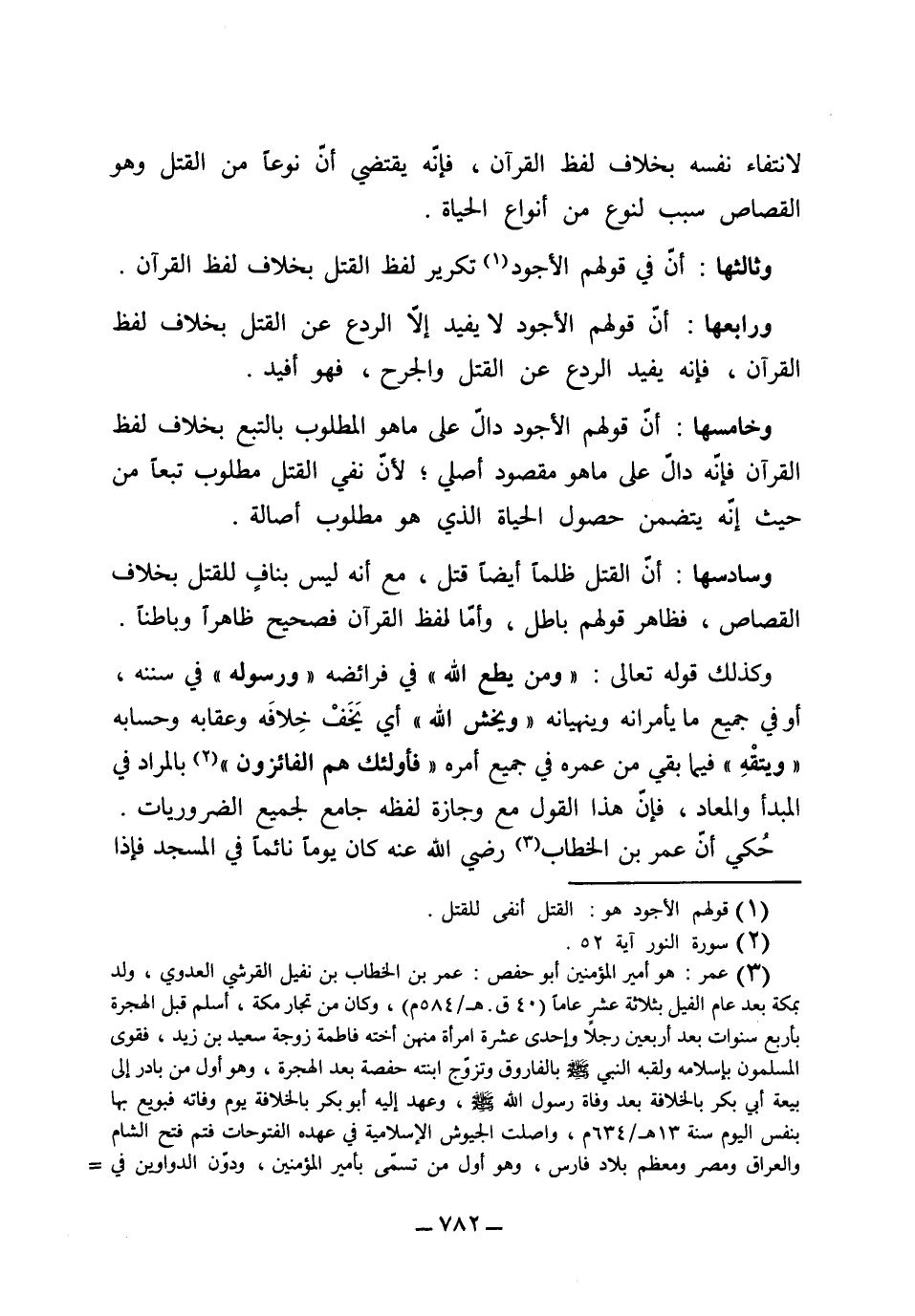 (وخامسها) : أن قولهم الأجود دال على ما هو المطلوب بالتبع بخلاف لفظ القرآن فإنه دال على ما هو مقصود أصلي، لأن نفي القتل مطلوب تبعاً من حيث إنه يتضمن حصول الحياة الذي هو مطلوب أصالة. (وسادسها) : أن القتل ظلماً أيضاً قتل مع أنه ليس بناف للقتل بخلاف القصاص فظاهر قولهم باطل وأما لفظ القرآن فصحيح ظاهراً وباطناً. وكذلك قوله تعالى: {مع يطع الله} في فرائضه {ورسوله} في سننه أو في جميع ما يأمرانه وينهيانه {ويخشى الله} أي يخف خلافه وعقابه وحسابه {ويتقه} فيما بقي من عمره في جميع أمره {فأولئك هم الفائزون} بالمراد في المبدأ والمعاد، فإن هذا القول مع وجازة لفظه جامع لجميع الضروريات (حكي) أن عمر بن الخطاب رضي الله عنه كان يوماً نائماً في المسجد فإذا