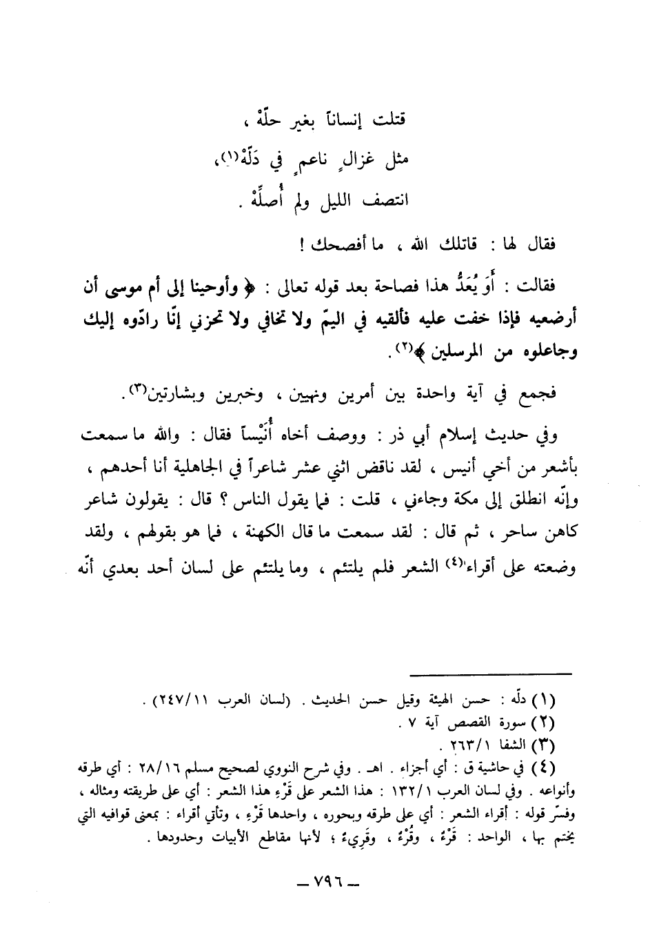 فقال لها: قاتلك الله ما أفصحك، فقالت: أو بعد هذا فصاحة بعد قوله تعالى: {وأوحينا إلى أم موسى أن أرضعيه فإذا خفت عليه فألقيه في اليم ولا تخافي ولا تحزني. إنا رادوه إليك وجاعلوه من المرسلين} فجمع في آية واحدة بين أمرين ونهيين وخبرين وبشارتين.. وفي حديث إسلام أبي ذر ووصف أخاه أنيساً فقال: والله ما سمعت بأشعر من أخي أنيس لقد ناقض اثني عشر شاعراً في الجاهلية أنا أحدهم، وأنه انطلق إلى مكة وجاءني، قلت: فما يقول الناس، قال: يقولون شاعر كاهن ساحر ثم قال: لقد سمعت ما قال الكهنة فما هو قولهم ولقد وضعته على إقراء الشعر فلم يلتئم وما يلتئم على لسان أحد بعدي إنه