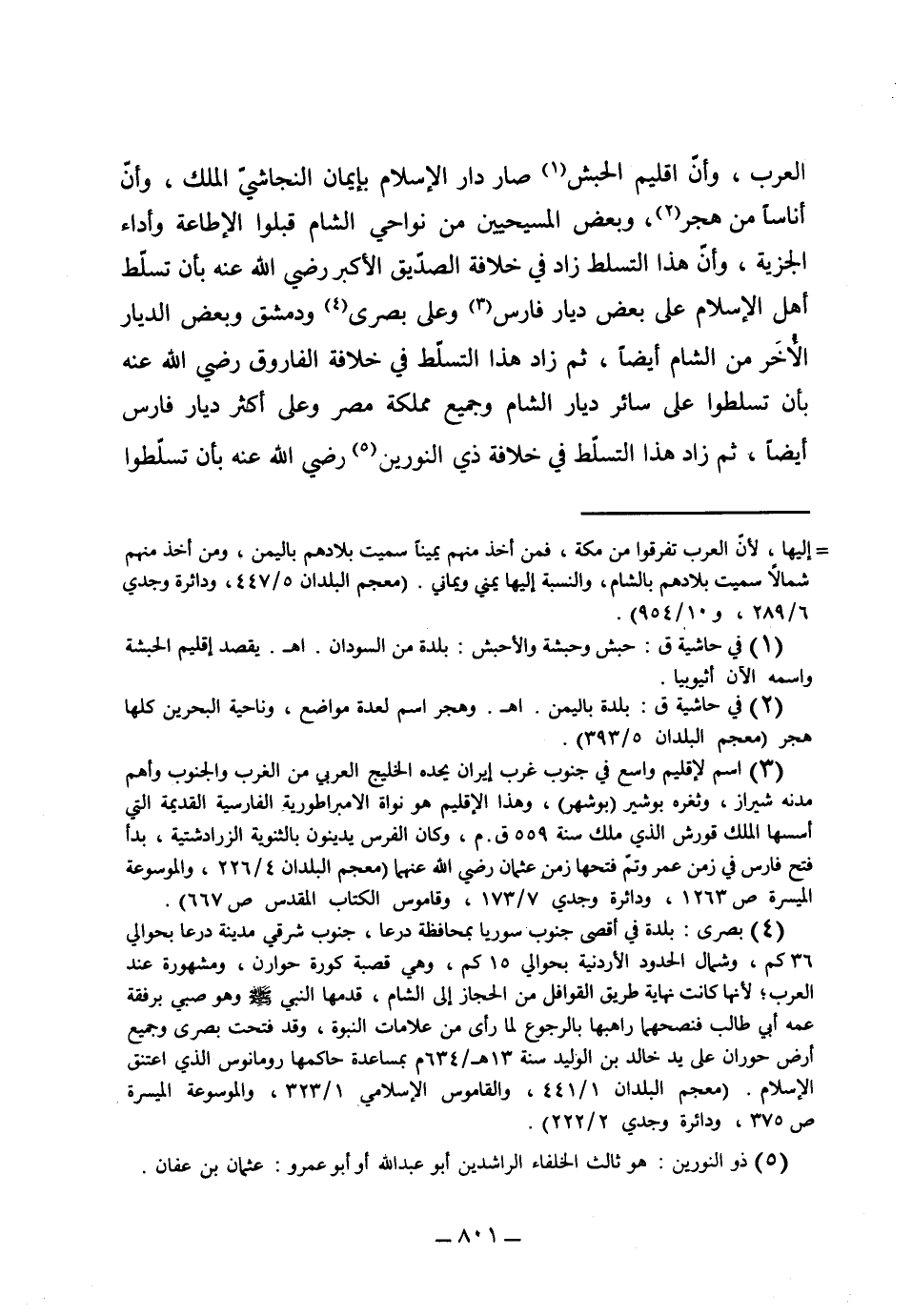 العرب، وأن إقليم الحبش صار دار الإسلام بإيمان النجاشي الملك، وأن أناساً من هجر وبعض المسيحيين من نواحي الشام قبلوا الإطاعة وأداء الجزية، وأن هذا التسلط زاد في خلافة الصديق الأكبر رضي الله عنه بأن تسلط أهل الإسلام على بعض ديار فارس وعلى بصرى ودمشق، وبعض الديار الأخرى من الشام أيضاً، ثم زاد هذا التسلط في خلافة الفاروق رضي الله عنه بأن تسلطوا على سائر ديار الشام وجميع مملكة مصر، وعلى أكثر ديار فارس أيضاً، ثم زاد هذا التسلط في خلافة ذي النورين رضي الله عنه، بأن تسلطوا