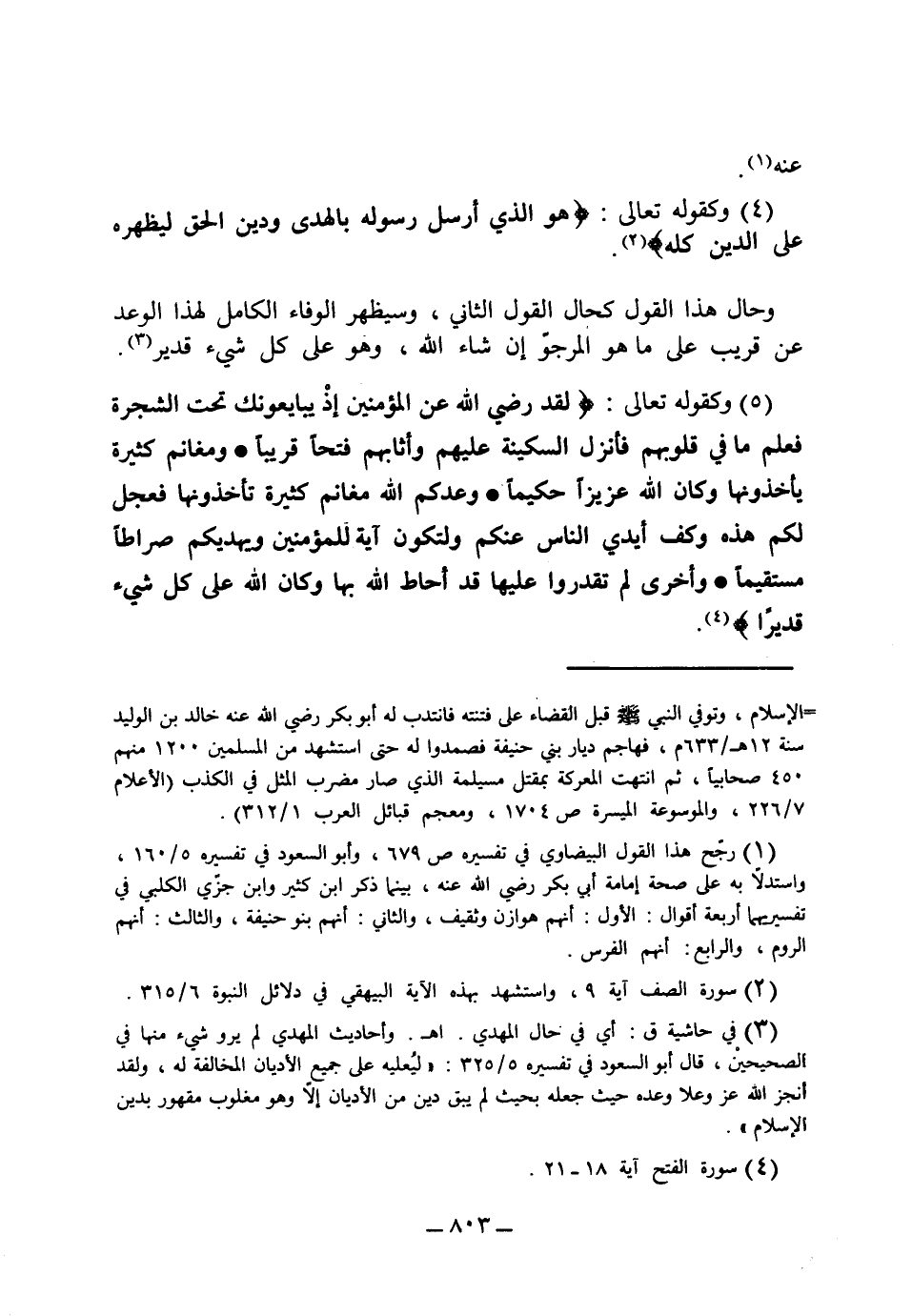 عنه. 5- وكقوله تعالى: {هو الذي أرسل رسوله بالهدى ودين الحق ليظهره على الدين كله} . وحال هذا القول كحال القول الثاني وسيظهر الوفاء الكامل لهذا الوعد عن قريب على ما هو المرجو إن شاء الله. وهو على كل شيء قدير. 5- وكقوله تعالى: {لقد رضي الله عن المؤمنين إذ يبايعونك تحت الشجرة فعلم ما في قلوبهم فأنزل السكينة عليهم وأثابهم فتحاً قريباً. ومغانم كثيرة يأخذونها وكان الله عزيزاً حكيماً. وعدكم الله مغانم كثيرة تأخذونها فعجل لكم هذه وكف أيدي الناس عنكم. ولتكون آية للمؤمنين ويهديكم صراطاً مستقيماً. وأخرى لم تقدروا عليها قد أحاط الله بها وكان الله على كل شيء