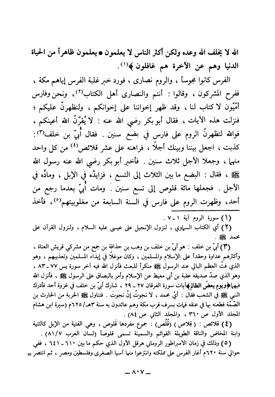 الله لا يخلف الله وعده ولكن أكثر الناس لا يعلمون. يعلمون ظاهراً من الحياة الدنيا وهم عن الآخرة غافلون} . الفرس كانوا مجوساً والروم نصارى، فورد خبر غلبة الفرس إياهم مكة ففرح المشركون وقالوا أنتم والنصارى أهل الكتاب ونحن وفارس أميون لا كتاب لنا، وقد ظهر إخواننا على إخوانكم، ولنظهرن عليكم. فنزلت هذه الآيات. فقال أبو بكر رضي الله عنه: لا يقرن الله أعينكم فو الله لتظهرن الروم على فارس في بضع سنين فقال أُبَيّ بن خلف: كذبت اجعل بيننا وبينك أجلاً فراهنه على عشر قلائص من كل واحد منهما وجعلا الأجل ثلاث سنين فأخبر أبو بكر رضي الله عنه رسول الله صلى الله عليه وسلم فقال: البضع ما بين الثلاث إلى التسع فزايده في الإبل وماده في الأجل، فجعلها مائة قلوص إلى تسع سنين، ومات أبي بعد ما رجع من أحد وظهرت الروم على فارس في السنة السابعة من مغلوبيتهم فأخذ