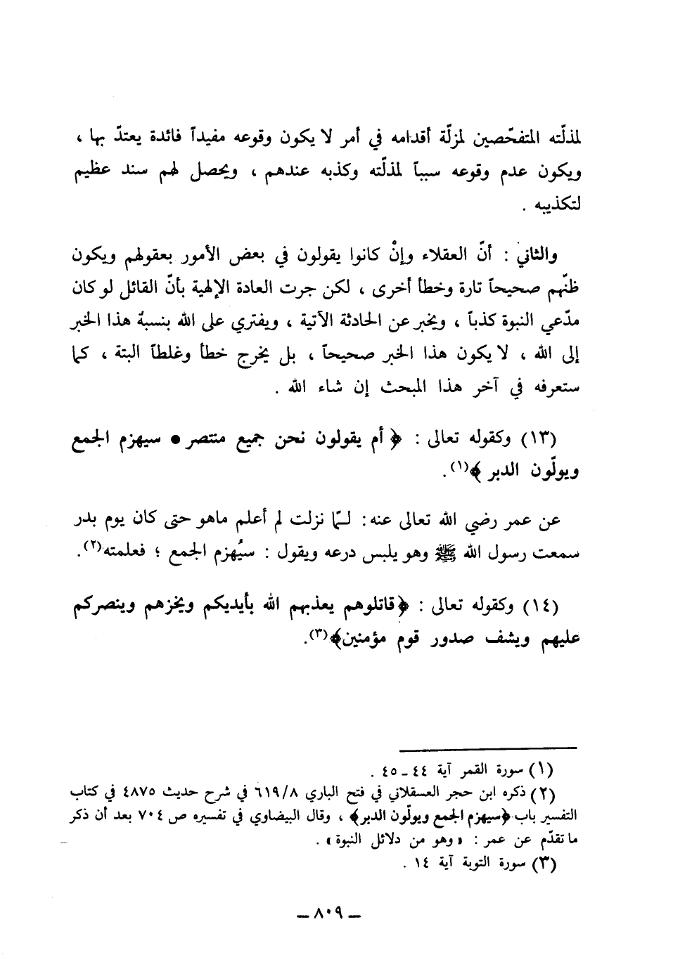 (والثاني) : أن العقلاء وإن كانوا يقولون في بعض الأمور بعقولهم ويكون ظنهم صحيحاً تارةً وخطأ أخرى لكن جرت العادة الإلهية بأن القائل لو كان مدعي النبوة كذباً ويخبر عن الحادثة الآتية، ويفتري على الله بنسبة هذا الخبر إلى الله، لا يكون هذا الخبر صحيحاً بل يخرج خطأ وغلطاً ألبتة كما ستعرف في آخر هذا المبحث إن شاء الله. 13- وكقوله تعالى: {أم يقولون نحن جميع منتصر سيهزم الجمع ويولون الدبر} . عن عمر رضي الله تعالى عنه أنه قال لما نزلت: لم أعلم ما هو حتى كان يوم بدر سمعت رسول الله صلى الله عليه وسلم وهو يلبس درعه ويقول: {سيهزم الجمع} . فعلمته.