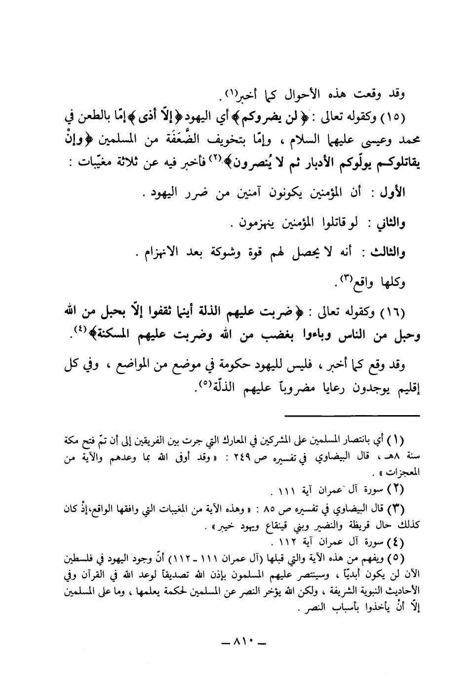 وقد وقعت هذه الأحوال كما أخبر. 15- وكقوله تعالى: {لن يضروكم إلا أذى} إما بالطعن في محمد وعيسى عليهما السلام، وإما بتخويف الضعفة من المسلمين {وإن يقاتلوكم يولوكم الأدبار ثم لا ينصرون} فأخبر فيه عن ثلاث مغيبات: (الأول) : أن المؤمنين يكونون آمنين من ضرر اليهود. (والثاني) : لو قاتلوا المؤمنين ينهزمون. (والثالث) : أنه لا يحصل لهم قوة وشوكة بعد الانهزام وكلها وقع. 16- وكقوله تعالى: {ضربت عليهم الذلة أينما ثقفوا إلا بحبل من الله وحبل من الناس وباءوا بغضب من الله وضربت عليهم المسكنة} . وقد وقع كما أخبر وليس لليهود حكومة في موضع من المواضع وفي كل إقليم يوجدون رعايا مضروباً عليهم الذلة