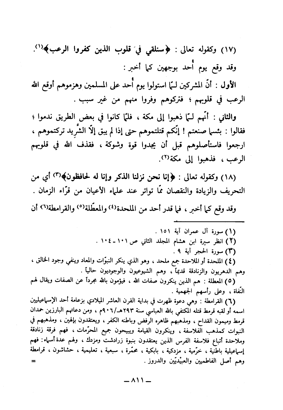 17- وكقوله تعالى: {سنلقي في قلوب الذين كفروا الرعب} وقد وقع يوم أحد بوجهين كما أخبر. (الأول) : أن المشركين لما استولوا يوم أحد على المسلمين وهزموهم أوقع الله الرعب في قلوبهم فتركوهم وفروا منهم من غير سبب. (والثاني) : أنهم لما ذهبوا إلى مكة، فلما كانوا في بعض الطريق ندموا فقالوا بئس ما صنعتم إنكم قتلتموهم حتى إذا لم يبق إلا الشريد تركتموهم ارجعوا فاستأصلوهم قبل أن يجدوا قوة وشوكة، فقذف الله في قلوبهم الرعب فذهبوا إلى مكة.