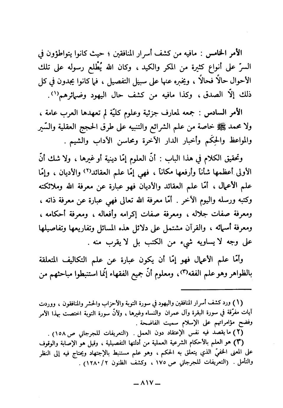(الأمر السادس) جمعه لمعارف جزئية وعلوم كلية لم تعهد العرب عامة ولا محمد صلى الله عليه وسلم خاصة من علم الشرائع والتنبيه على طرق الحجج العقلية والسير والمواعظ والحكم، وأخبار الدار الآخرة ومحاسن الآداب والشيم. وتحقيق الكلام في هذا الباب أن العلوم إما دينية أو غيرها ولا شك أن الأولى أعظمها شأناً وأرفعها مكاناً، فهي إما علم العقائد والأديان، وإما علم الأعمال. أما علم العقائد والأديان فهو عبارة عن معرفة الله وملائكته وكتبه ورسله واليوم الآخر، أما معرفة الله تعالى فهي عبارة عن معرفة ذاته ومعرفة صفات جلاله ومعرفة صفات إكرامه وأفعاله ومعرفة أحكامه ومعرفة أسمائه، والقرآن مشتمل على دلائل هذه المسائل وتفاريعها وتفاصيلها على وجه لا يساويه شيء من الكتب، بل لا يقرب منه، وأما علم الأعمال فهو إما أن يكون عبارة عن علم التكاليف المتعلقة بالظواهر، وهو علم الفقه. ومعلوم أن جميع الفقهاء إنما استنبطوا مباحثهم من