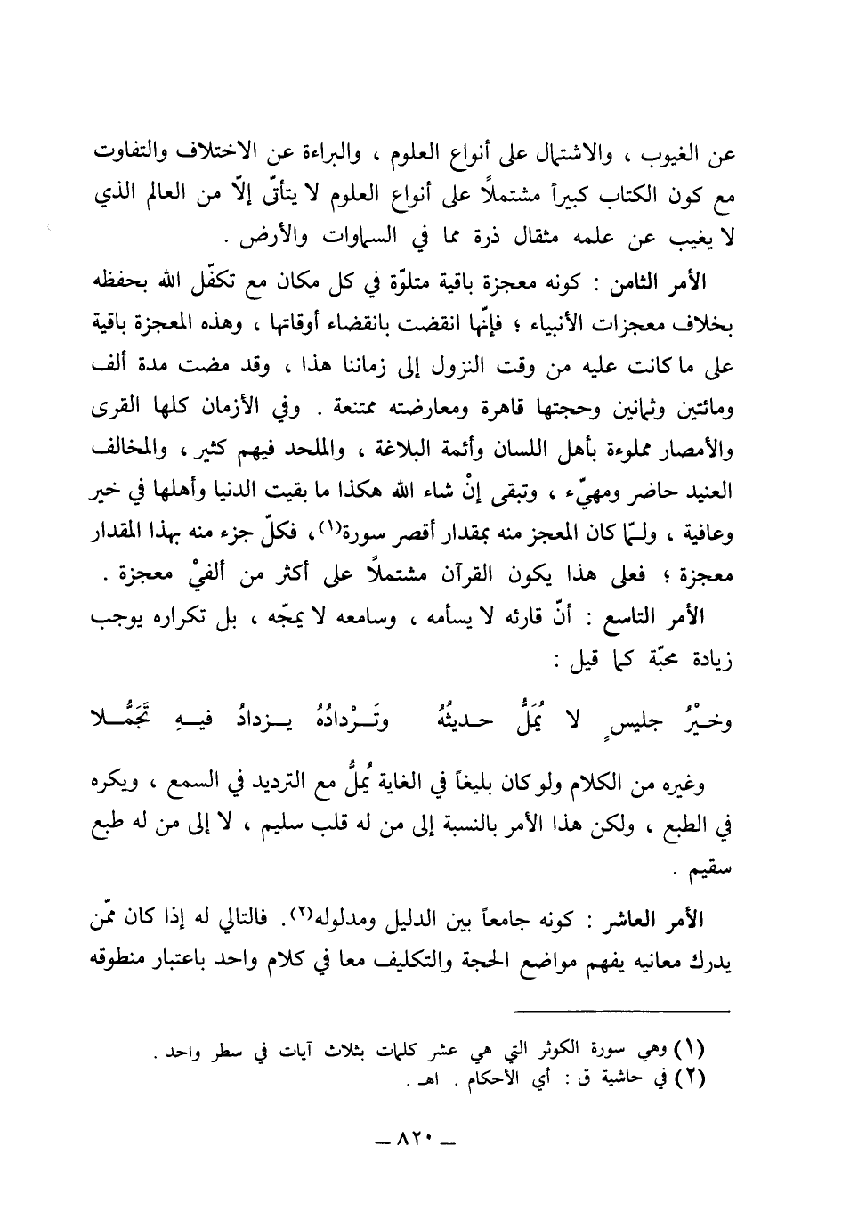(الأمر الثامن) كونه معجزة باقية متلوّة في كل مكان مع تكفل الله بحفظه، بخلاف معجزات الأنبياء فإنها انقضت بانقضاء أوقاتها، وهذه المعجزة باقية على ما كانت عليه من وقت النزول إلى زماننا هذا، وقد مضت مدة ألف ومائتين وثمانين وحجتها قاهرة، ومعارضته ممتنعة وفي الأزمان كلها القرى والأمصار مملوءة بأهل اللسان وأئمة البلاغة، والملحد فيهم كثير والمخالف العنيد حاضر ومهيأ، وتبقى إن شاء الله هكذا ما بقيت الدنيا وأهلها في خير وعافية. ولما كان المعجز منه بمقدار أقصر سورة فكل جزء منه بهذا المقدار معجزة، فعلى هذا يكون القرآن مشتملاً على أكثر من ألفي معجزة.