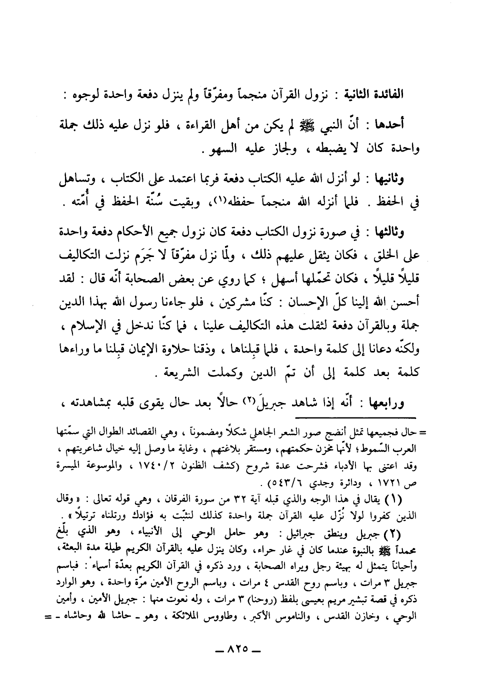 (الفائدة الثانية) نزول القرآن منجماً ومفرقاً ولم ينزل دفعة واحدة بوجوه: (أحدها) أن النبي صلى الله عليه وسلم لم يكن من أهل القراءة، فلو نزل عليه ذلك جملة واحدة كان لا يضبطه، ولجاز عليه السهو. (وثانياً) أنه لو أنزل عليه الكتاب دفعة فربما اعتمد على الكتاب وتساهل في الحفظ، فلما أنزل الله منجماً حفظه وبقي سنة الحفظ في أمته. (وثالثها) في صورة نزول الكتاب دفعة لو كان نزول جميع الأحكام دفعة واحدة على الخلق لكان يثقل عليهم ذلك، ولما نزل مفرقاً لا جرم نزلت التكاليف قليلاً قليلاً، فكان تحملها أسهل، كما روي عن بعض الصحابة أنه قال: لقد أحسن الله إلينا كل الإحسان، كنا مشركين فلو جاءنا رسول الله بهذا الدين جملة وبالقرآن دفعة لثقلت هذه التكاليف علينا فما كنا ندخل في الإسلام ولكنه دعانا إلى كلمة واحدة فلما قبلناها وذقنا حلاوة الإيمان قبلنا ما وراءها كلمة بعد كلمة إلى أن تم الدين وكملت الشريعة. (ورابعها) أنه إذا شاهد جبريل حالاً بعد حال يقوى قلبه بمشاهدته