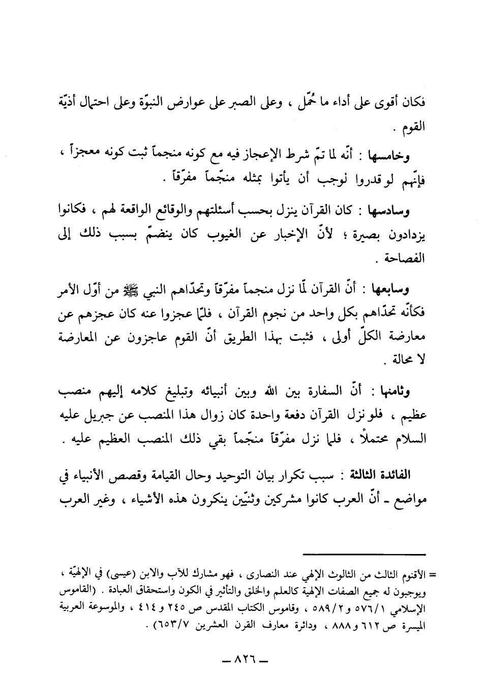 فكان أقوى على أداء ما حمل، وعلى الصبر على عوارض النبوة، وعلى احتمال أذية القوم. (وخامسها) أنه لما تم شرط الإعجاز فيه مع كونه منجماً ثبت كونه معجز، فإنهم لو قدروا لوجب أن يأتوا بمثله منجماً مفرقاً. (وسادسها) كان القرآن ينزل بحسب أسئلتهم والوقائع الواقعة لهم، فكانوا يزدادون بصيرة، لأن الإخبار عن العيوب كان ينضم بسبب ذلك إلى الفصاحة. (وسابعها) أن القرآن لما نزل منجماً مفرقاً وتحداهم النبي صلى الله عليه وسلم من أول الأمر فكأنه تحداهم بكل واحد من نجوم القرآن، فلما عجزوا عنه كان عجزهم عن معارضة الكل أولى فثبت بهذا الطريق أن القوم عاجزون عن المعارضة لا محالة.