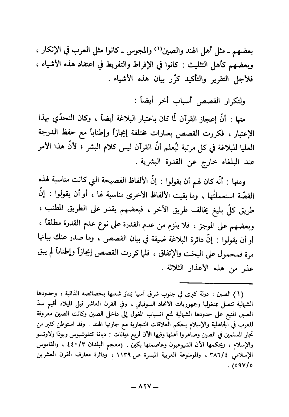 بعضهم مثل أهل الهند والصين والمجوس كانوا مثل العرب في الإنكار، وبعضهم كأهل التثليث كانوا في الإفراط والتفريط في اعتقاد هذه الأشياء، فلأجل التقرير والتأكيد كرر بيان هذه الأشياء. ولتكرار القصص أسباب أخر أيضاً، منها: أن إعجاز القرآن لما كان باعتبار البلاغة أيضاً وكان التحدي بهذا الاعتبار فكررت القصص بعبارات مختلفة إيجازاً وإطناباً مع حفظ الدرجة العليا للبلاغة في كل مرتبة ليعلم أن القرآن ليس كلام البشر، لأن هذا الأمر عند البلغاء خارج عن القدرة البشرية. ومنها أنه كان لهم أن يقولوا إن الألفاظ الفصيحة التي كانت مناسبة لهذه القصص استعملتها وما بقيت الألفاظ الأخرى مناسبة لها، وأن يقولوا إن طريق كل بليغ يخالف طريق الآخر، فبعضهم يقدر على الطريق المطنب، وبعضهم يقدر على الموجز فلا يلزم من عدم القدرة على نوع عدم القدرة مطلقاً. أو أن يقولوا إن دائرة البلاغة ضيقة في بيان القصص وما صدر عنك بيانها مرة محمول على البخت والاتفاق فلما كررت القصص إيجازاً وإطناباً لم يبق عذر من هذه الأعذار الثلاثة.