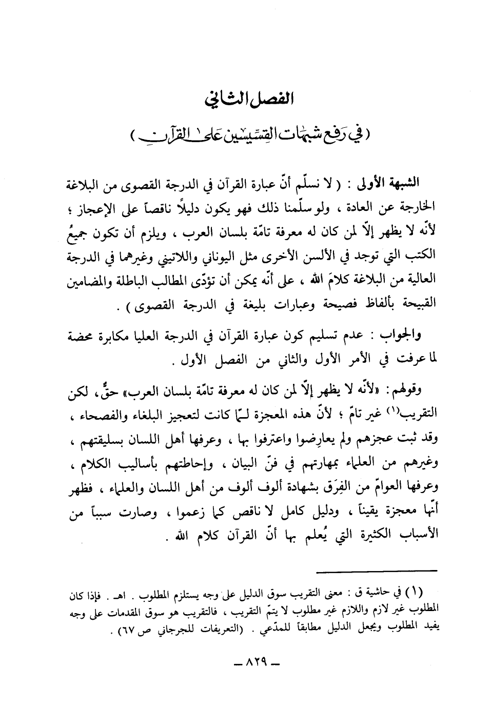 (والجواب) عدم تسليم كون عبارة القرآن في الدرجة العليا - مكابرة محضة، لما عرفت في الأمر الأول والثاني من الفصل الأول، وقولهم لأنه لا يظهر إلا لمن كانت له معرفة تامة حقة بلسان العرب، لكن التقريب غير تام لأن هذه المعجزة لما كانت لتعجيز البلغاء والفصحاء وقد ثبت عجزهم ولم يعارضوا واعترفوا بها وعرفها أهل اللسان بسليقتهم وغيرهم من العلماء بمهارتهم في فن البيان وإحاطتهم بأساليب الكلام وعرفها العوام من الفرق بشهادة ألوف ألوف من أهل اللسان والعلماء، فظهر أنها معجزة يقيناً، ودليل كامل لا ناقص كما زعموا، وصارت سبباً من الأسباب الكثيرة التي يعلم بها أن القرآن كلام الله