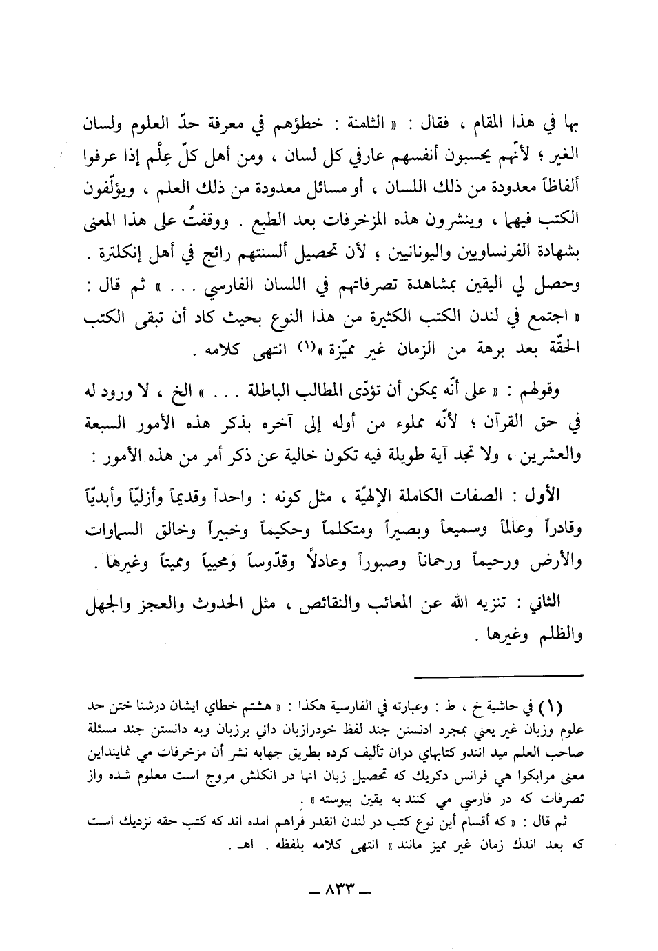 بها في هذا المقام. قال: (الثامنة) خطؤهم في معرفة حد العلوم ولسان الغير، لأنهم يحسبون أنفسهم عارفي كل لسان ومن أهل كل علم إذا عرفوا ألفاظاً معدودة من ذلك اللسان أو مسائل معدودة من ذلك العلم ويؤلفون الكتب فيهما وينشرون هذه المزخرفات بعد الطبع، ووقفت على هذا المعنى بشهادة الفرنساويين واليونانيين لأن تحصيل ألسنتهم رائج في أهل إنكلترة، وحصل لي اليقين بمشاهدة تصرفاتهم في اللسان الفارسي) انتهى، ثم قال: (اجتمع في لندن الكتب الكثيرة من هذا النوع بحيث كادت تبقى الكتب الحقة بعد برهة من الزمان غير مميزة) ، انتهى كلامه. وقولهم على أنه يمكن أن تؤدي المطالب الباطلة إلخ -لا ورود له في حق القرآن، لأنه مملوء من أوله إلى آخره بذكر هذه الأمور السبعة والعشرين، ولا تجد آية طويلة فيه تكون خالية من ذكر أمر من هذه الأمور: