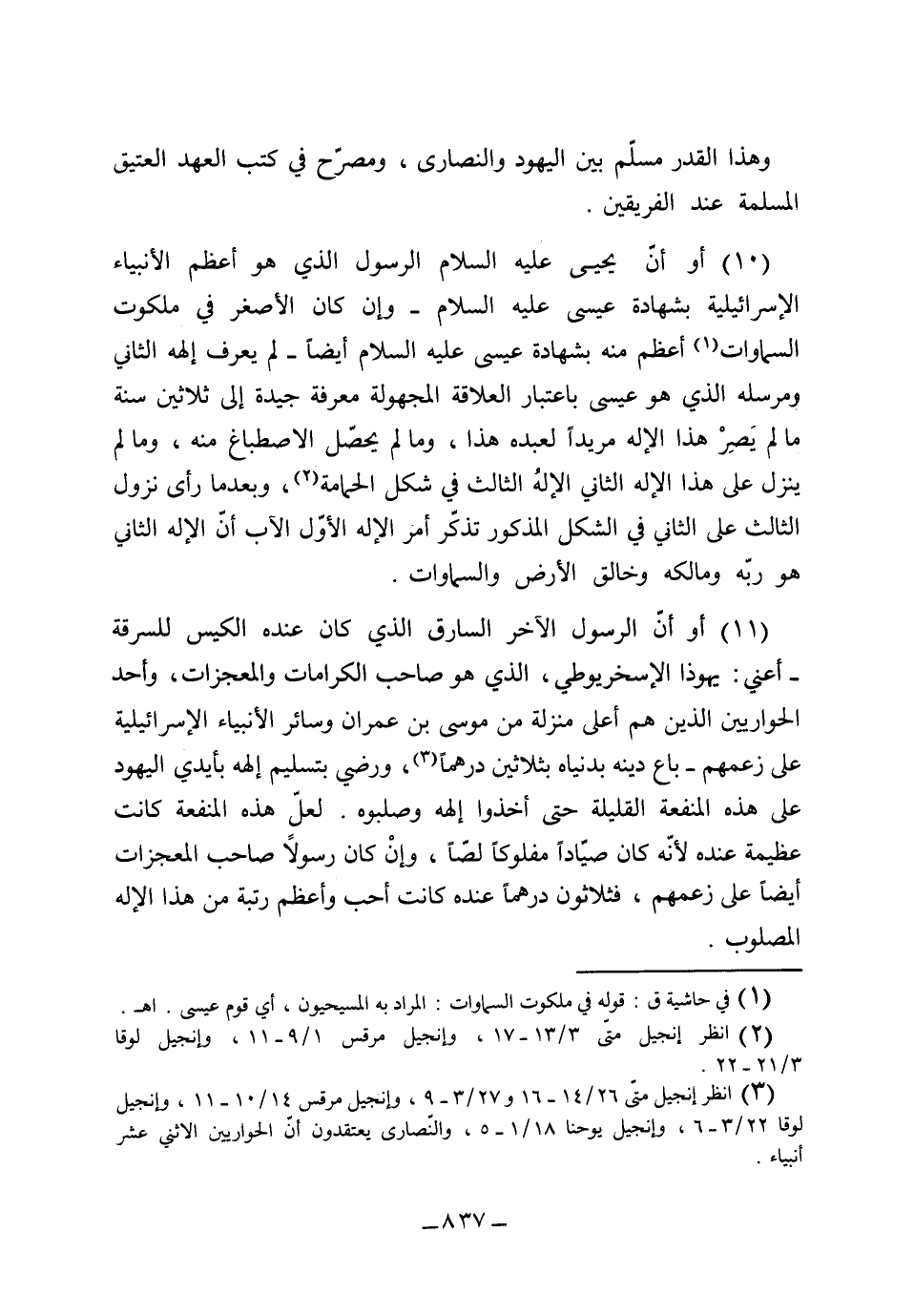 -[11] أو أن الرسول الآخر السارق الذي كان عنده الكيس للسرقة أعني يهود الأسخريوطي الذي هو صاحب الكرامات والمعجزات وأحد الحواريين الذين هم أعلى منزلة من موسى بن عمران وسائر الأنبياء الإسرائيلية على زعمهم باع دينه بدنياه بثلاثين درهماً، ورضي بتسليم إلهه بأيدي اليهود على هذه المنفعة القليلة حتى أخذوا إلهه وصلبوه لعل هذه المنفعة كانت عظيمة عنده، لأنه كان صياداً مفلوكاً لصاً، وإن كان رسولاً صاحب معجزات أيضاً على زعمهم فثلاثون درهماً عنده كانت أحب وأعظم رتبة من هذا الإله