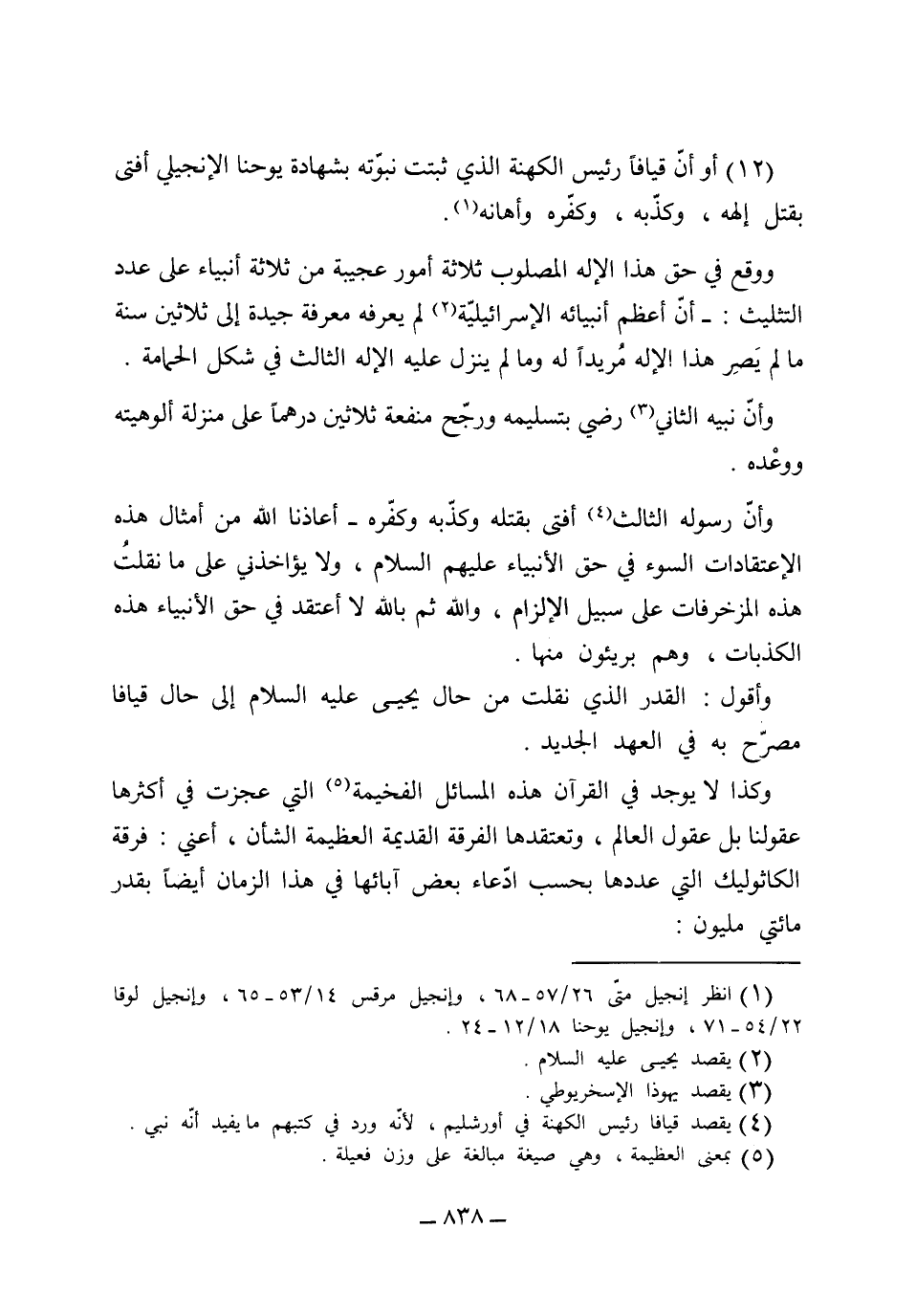 المصلوب. -[12] أو أن قيافا رئيس الكهنة الذي ثبتت نبوته بشهادة يوحنا الإنجيلي أفتى بقتل إلهه وكذبه وكفره وأهانه ووقع في حق هذا الإله المصلوب ثلاثة أمور عجيبة من ثلاثة أنبياء عدد التثليث أن اعظم أنبيائه الإسرائيلية لم يعرفه معرفة جيدة إلى ثلاثين سنة ما لم يصر هذا الإله مريداً له ولم ينزل عليه الإله الثالث في شكل الحمامة، وأن نبيه الثاني رضي بتسليمه ورجح منفعة ثلاثين درهماً منزلة ألوهيته ووعده، وأن رسوله الثالث أفتى بقتله وكذبه وكفره أعاذنا الله من أمثال هذه الاعتقادات السوء في حق الأنبياء عليهم السلام. ولا يؤاخذني على ما نقلت هذه المزخرفات على سبيل الإلزام والله ثم بالله لا أعتقد في حق الأنبياء هذه الكذبات وهم بريئون منها، وأقول القدر الذي نقلت من حال يحيى عليه السلام إلى حال قيافا مصرح به في العهد الجديد.