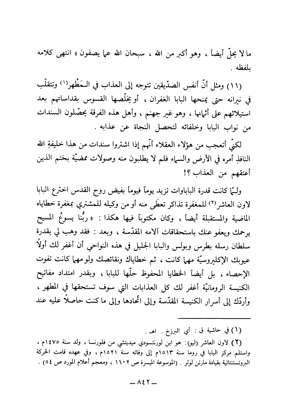 ومثل [11] أن أنفس الصديقين تتوجه إلى العذاب في المطهر وتتقلب في نيرانه حتى يمنحها البابا الغفران أو يخلصها القسوس بقداساتهم بعد استيلائهم على أثمانها، وهو غير جهنم. وأهل هذه يحصلون السندات من نواب البابا وخلفائه لتحصيل النجاة من عذابه. لكن العجب من هؤلاء العقلاء أنهم إذا اشتروا سندات من خليفة الله النافذ أمره في الأرض والسماء فلم لا يطلبون منه وصولات ممضية بختم الذين أعتقهم من العذاب، ولما كانت قدرة الباباوات تزيد يوماً فيوماً بفيض روح القدس اخترع البابا لاون العاشر للمغفرة تذاكر تعطى منه أو من وكيله للمشتري بمغفرة خطاياه الماضية والمستقبلة أيضاً، وكان مكتوباً فيها هكذا: (ربنا يسوع المسيح يرحمك ويعفو عنك باستحقاقات آلامه المقدسة. وبعد فقد وهب لي بقدرة سلطان رسله بطرس وبولس والبابا الجليل في هذه النواحي أن أغفر لك أولاً عيوبك الاكليروسية مهما كانت ثم خطاياك ونقائصك مهما كانت تفوت الإحصاء، بل أيضاً الخطايا المحفوظ حلها للبابا، وبقدر امتداد مفاتيح الكنيسة الرومانية أغفر لك كل العذابات التي سوف تستحقها في المطهر وأردك إلى أسرار الكنيسة المقدسة وإلى اتحادها وإلى ما كنت حاصلاً عليه عند