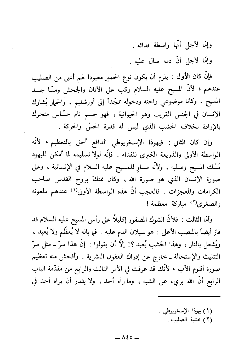 زعمهم، وإما لأجل أنها واسطة فداء، وإما لأجل أن دمه سال عليه. فإن كان الأول يلزم أن يكون نوع الحمير معبوداً لهم أعلى من الصليب عندهم، لأن المسيح عليه السلام ركب على الأتان والجحش ومساجد المسيح وكانا موضوعي راحته ودخوله ممجداً إلى أورشليم، والحمار يشارك الإنسان في الجنس القريب والحيوانية، فهو جسم نام حساس متحرك بالإرداة بخلاف الخشب الذي ليست له قدرة الحس والحركة. وإن كان الثاني فيهودا الاسخريوطي الدافع أحق بالتعظيم لأنه الواسطة الأولى والذريعة الكبرى للفداء، فإنه لولا تسليمه لما أمكن لليهود مسك المسيح وصلبه، ولأنه مساوٍ للمسيح عليه السلام في الإنسانية وعلى صورة الإنسان الذي هو صورة الله، وكان ممتلئاً بروح القدس صاحب الكرامات والمعجزات فالعجب أن هذه الواسطة الأولى عندهم ملعونة والصغرى مباركة معظمة.