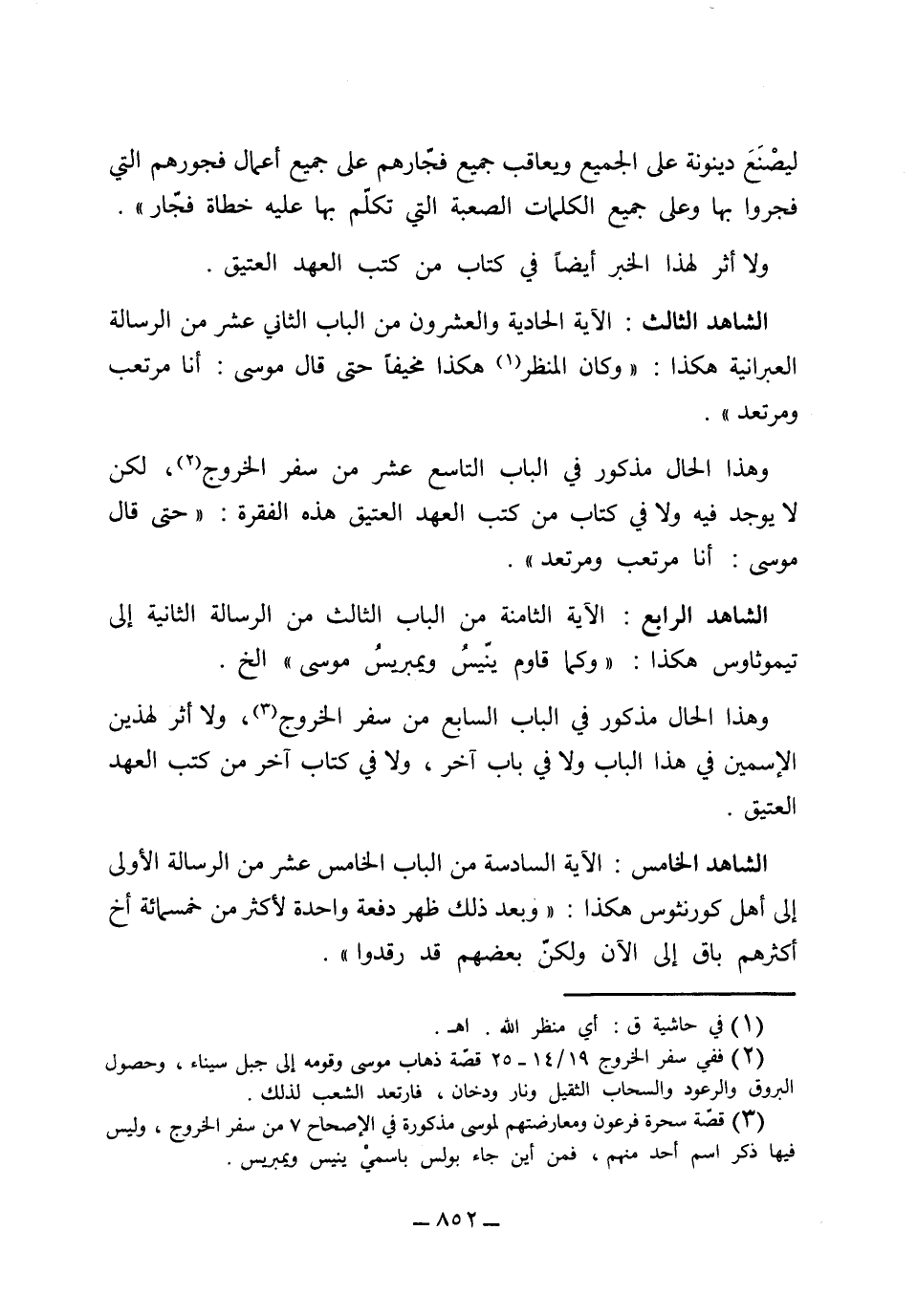 (ليصنع دينونة على الجميع ويعاقب جميع فجارهم على جميع أعمال فجورهم التي فجروا بها، وعلى جميع الكلمات الصعبة التي تكلم بها عليه خطاط فجار) ولا أثر لهذا الخبر أيضاً في كتاب من كتب العهد العتيق. (الشاهد الثالث) الآية الحادية والعشرون من الباب الثاني عشر من الرسالة العبرانية هكذا: (وكان المنظر هكذا مخيفاً حتى قال موسى أنا مرتعب ومرتعد) ، وهذا الحال مذكور في الباب التاسع عشر من سفر الخروج، لكن لا توجد فيه ولا في كتاب من كتب العهد العتيق هذه الفقرة: (حتى قال موسى أنا مرتعب ومرتعد) .) الشاهد الرابع) الآية الثامنة من الباب الثالث من الرسالة الثانية إلى تيموثاوس هكذا: (وكما قاوم ينيس ويمبريس موسى) إلخ، وهذا الحال مذكور في الباب السابع من سفر الخروج ولا أثر لهذين الاسمين في هذا الباب ولا في باب آخر ولا في كتاب آخر من كتب العهد العتيق. (الشاهد الخامس) الآية السادسة من الباب الخامس عشر من الرسالة الأولى إلى أهل قورنيثوس هكذا: (وبعد ذلك ظهر دفعة واحدة لأكثر من خمسمائة أخ أكثرهم باق إلى الآن ولكن بعضهم قد رقدوا)