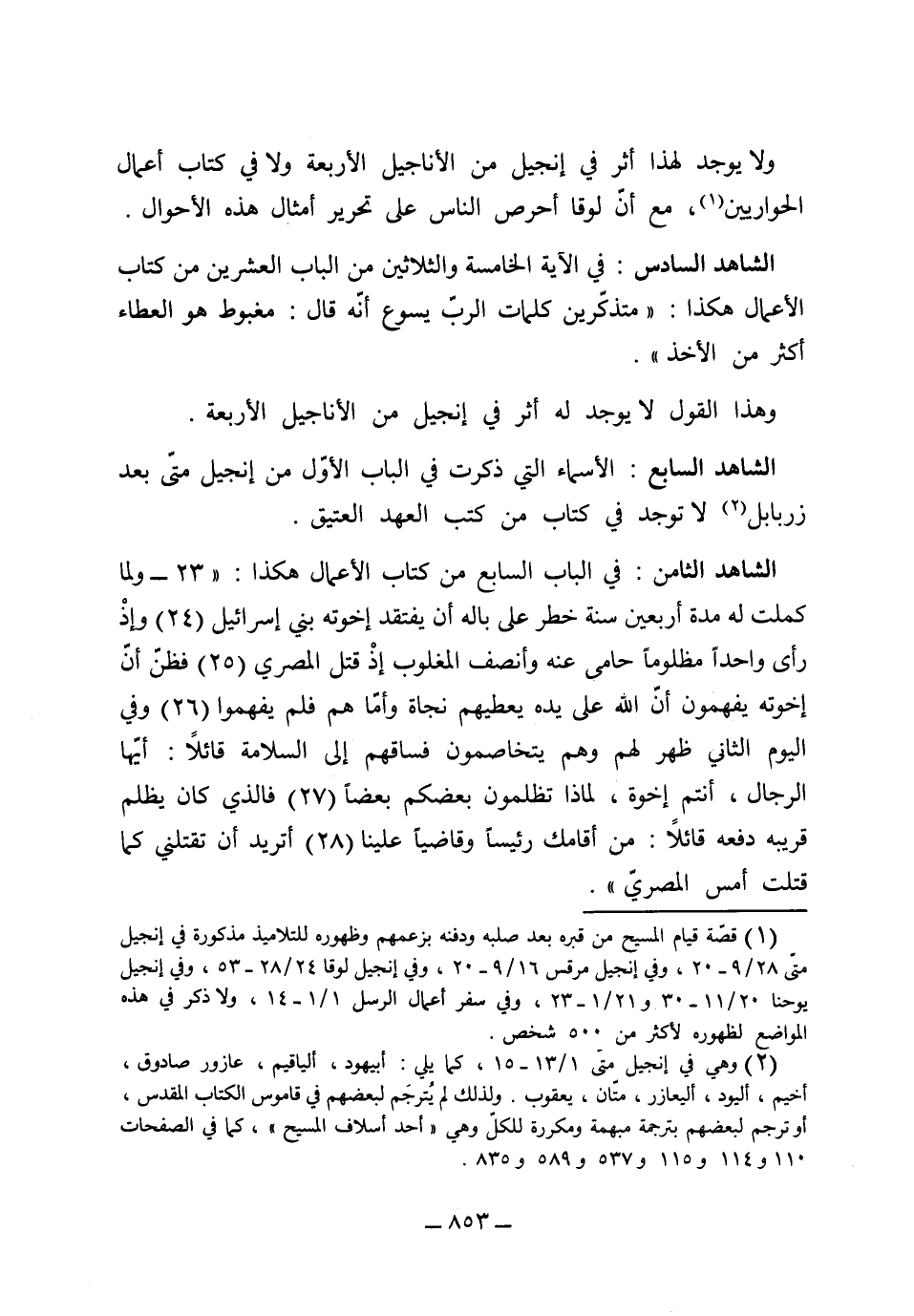 (الشاهد السابع) الأسماء التي ذكرت في الباب الأول من إنجيل متى بعد زربابل لا توجد في كتاب من كتب العهد العتيق. (الشاهد الثامن) في الباب السابع من كتاب الأعمال هكذا: 23 (ولما كملت له مدة أربعين سنة خطر على باله أن يفتقد إخوته بني إسرائيل) . 24: (وإذا رأى واحداً مظلوماً حامى عنه وأنصف المغلوب إذ قتل المصري) . 25: (فظن أن إخوته يفهمون أن الله على يده يعطيهم نجاة وأما هم فلم يفهموا) . 26: (وفي اليوم الثاني ظهر لهم وهم يتخاصمون فساقهم إلى السلامة قائلاً: أيها الرجال أنتم أخوة لماذا تظلمون بعضكم بعضاً) 27: (فالذي كان يظلم قريبه دفعه قائلاً: من أقامك رئيساً وقاضياً علينا) 28: (أتريد أن تقتلني كما قتلت أمس المصري) ،.