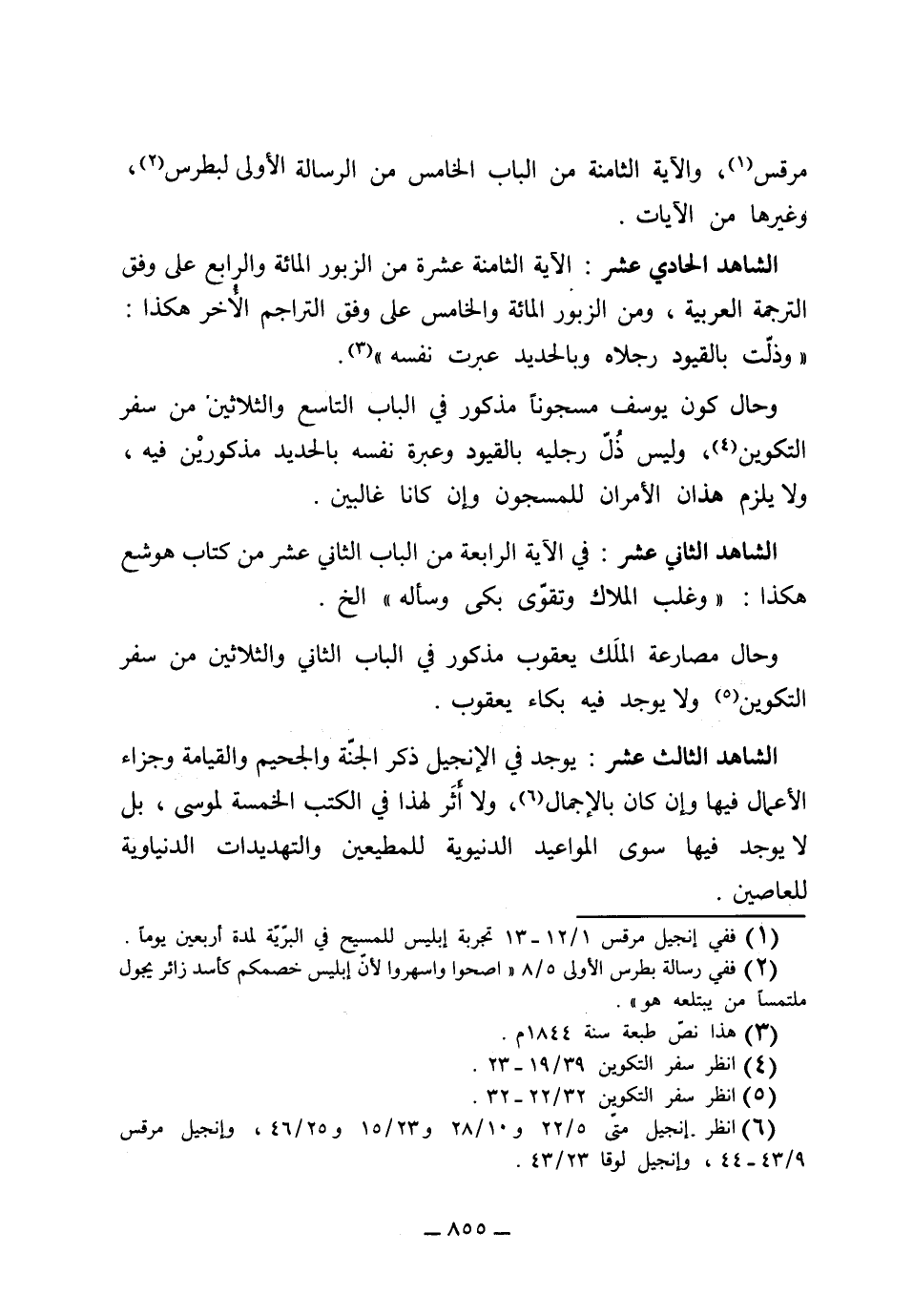 مرقس، والآية الثامنة من الباب الخامس من الرسالة الأولى لبطرس وغيرها من الآيات. (الشاهد الحادي عشر) الآية الثامنة عشرة من الزبور المائة والرابع على وفق الترجمة العربية، ومن الزبور المائة والخامس على وفق التراجم الأخر هكذا: (وذلت بالقيود رجلاه وبالحديد عبرت نفسه) وحال كون يوسف مسجوننا مذكور في الباب التاسع والثلاثين من سفر التكوين وليس ذلت رجليه بالقيود وعبرت نفسه بالحديد مذكورين فيه، ولا يلزم هذان الأمران للمسجون وإن كانا غالبين. (الشاهد الثاني عشر) في الآية الرابعة من الباب الثاني عشر من كتاب هوشع هكذا: (وغلب الملاك وتقوى وبكى وسأله) إلخ وحال مصارعة الملك يعقوب مذكور في الباب الثاني والثلاثين من سفر التكوين ولا يوجد فيه بكاء يعقوب. (الشاهد الثالث عشر) يوجد في الإنجيل ذكر الجنة والجحيم والقيامة وجزاء الأعمال فيها وإن كان بالإجمال، ولا أثر لهذا في الكتب الخمسة لموسى، بل لا يوجد فيها سوى المواعيد الدنيوية للمطيعين والتهديدات الدنيوية للعاصين.